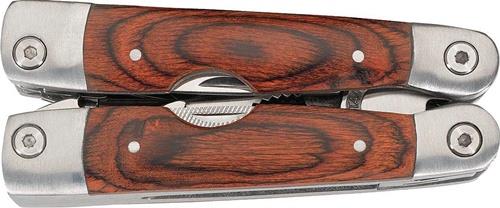 Leichmetall-Gehäuse · Pakkaholz-Einlage · Zange · Drahtschneider · Messerklinge · Klinge mit Wellenschliff · Säge · Flaschenöffner · verschiedenartige Schraubenzieher · Feile · Adapter mit 11 Bits · Nylonetui mit Gürtelschlaufe Weitere technische Eigenschaften: · Material: Leichtmetall · Zubehör: Nylonetui, Gürtelschlaufe · Oberfläche: Pakkaholz-Einlagen · Funktionen: 12