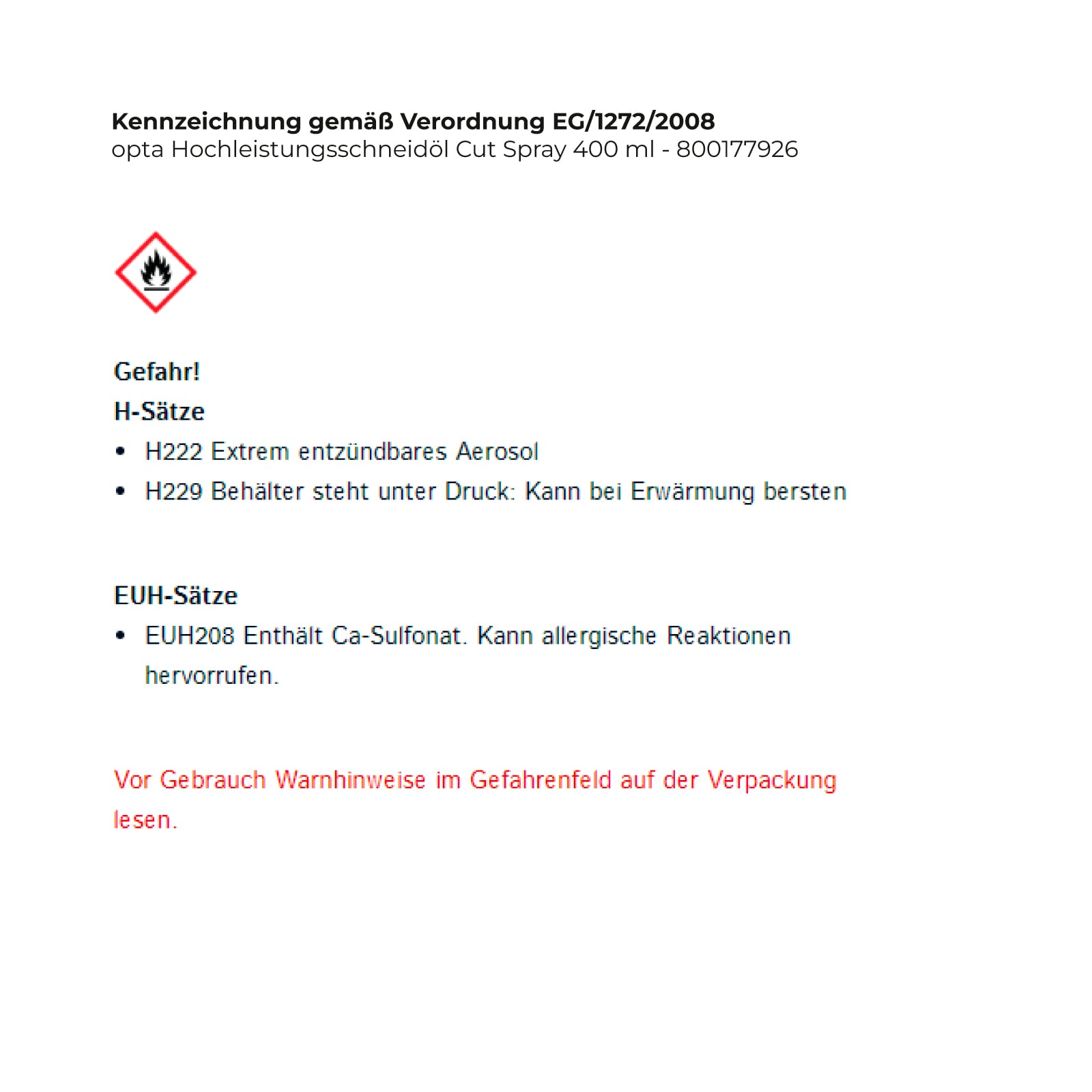 (vorm. opta Schneidölspray) chlorfrei - silikonfrei hochaktives Schneidöl-Spray für den punktuellen Einsatz in vielen Arbeitsbereichen, wie Zerspanung und Stahlbau für alle Metalle geeignet, besonders für rost- und säurebeständige Edelstähle für schwer zugängliche Bearbeitungsstellen z. B. bei Überkopfarbeiten gezielter Einsatz bei Montage und Reparatur besondere Vorteile: gute Haftfähigkeit, punktuelles Aufsprühen, längere Werkzeugstandzeiten