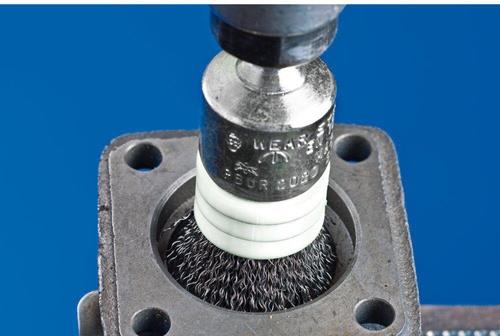 für leichte Bürstarbeiten wie Entgraten, Reinigen und Entrosten geeignet · Pinselbürste mit kunststoffüberzogenem Bürstenkörper · sehr gute Korrosionsbeständigkeit bei optimaler Standzeit · INOX-Besatz blau für den Einsatz auf allen Edelstählen (INOX) · wie z. B. V4A. Edelstahldraht (INOX) hält Temperaturen bis 450 °C stand · Schaft-Ø 6 mm Weitere technische Eigenschaften: · Antriebsart: Bohrmaschine, Biegwellenantrieb, Geradschleifer · Anwendungsempfehlung: Für besonders flexiblen Einsatz, für einen großen Aufspreizdurchmesser oder zum Erreichen schwer zugänglicher Stellen den Stützring zu Arbeitsbeginn entfernen. Für beste Leistung Werkzeugantrieb mit mindestens 300 Watt verwenden. Stützring entfernen, sobald der Besatz bis zum Stützring abgearbeitet ist. So kann der restliche Besatz freigesetzt und vollständig verbraucht werden. Bitte beachten Sie die empfohlenen Drehzahlen. · Bearbeitbare Werkstoffe: Titanlegierungen, weiche Titanlegierungen (Zugfestigkeit 500 N/mm²), Bronze, Aluminium, Nickelbasislegierungen (z. B. Inconell und Hasteloy), Kobaltbasislegierungen, NE-Metall hart, Edelstahl (INOX), Titan, Weitere NE-Metalle, Superlegierungen auf Nickel oder Titanbasis, Hochwarmfeste Werkstoffe · Bearbeitungsaufgaben: Aufrauen, Entlacken, Oxydschichten entfernen, Anlauffarben entfernen, Entrosten, Entgraten, Reinigen · Besatzmaterial: Edelstahldraht (INOX) · Länge, Besatz bis Ring: 13mm · Ø Schaft: 6mm · Ø Topf: 16mm · RPM, opt., bis: 9800RPM · RPM, opt., von: 6000RPM · Sicherheitshinweise: Beim Einspannen der Bürste ist darauf zu achten, dass der Schaft möglichst weit in die Aufnahme eingespannt wird. Dies gilt insbesondere für den Einsatz im hohen Drehzahlbereich. Die Mindesteinspannlänge beträgt 10 mm. · Vorteile: Sehr gute Korrosionsbeständigkeit. Ist der Besatz bis zum Stützring abgearbeitet kann dieser zur weiteren Nutzung entfernt werden, ohne dass sich das Bürstverhalten ändert. Durch den Kunststoffüberzug wird das Risiko der Kontaktkorrosion vermieden. Optimales Erreichen von schwer zugänglichen Stellen wie Vertiefungen und Bohrungen. Spreizung und Flexibilität des Bürstenbesatzes durch Stützring exakt regulierbar. Durch den Stützring wird ein seitliches Ausweichen der Drähte vermieden. Die Bürste ist entfettet und hinterlässt keine Ölrückstände auf dem Werkstück. Erzeugt feine Oberflächen.