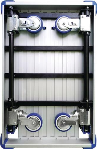 robuste Plattform aus Aluminium Kunststoff-Stoßschutzecken Dokumententasche am Schiebebügel gepolsterter Griffbereich Schiebebügel auszieh- und klappbar TPR Bereifung, spurlos 2 Lenk- und 2 Bockrollen Räder klappen automatisch ein und aus zusammengeklappt nur 90 mm hoch Anwendung: Zum Verstauen einfach den Schiebebügel runterklappen und die Räder schwenken automatisch ein