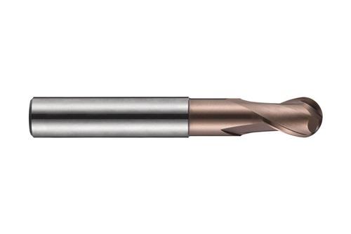 Extra kurzer kugelfräser mit 2 Schneiden · Durchmesser 5mm mit 9mm Schnittlänge · 50mm Gesamtlänge · 20mm erreichbare Lämge mit Halsfreischliff und 2.5mm Vollprofilradius · gemäß DORMER Standard mit einem 5mm Zylinderschaft · VHM mit TiSiN Beschichtung · 30° Helix und 3° Spanwinkel zum Kopierfräsen in Martensitischer · Austenitischer und Superaustenitisch · Duplex oder ausscheidungsgehärtem Edelstahl und Hochwarmfeste Legierungen Weitere technische Eigenschaften: · Schafttoleranz: h6 · Drallwinkel: 30