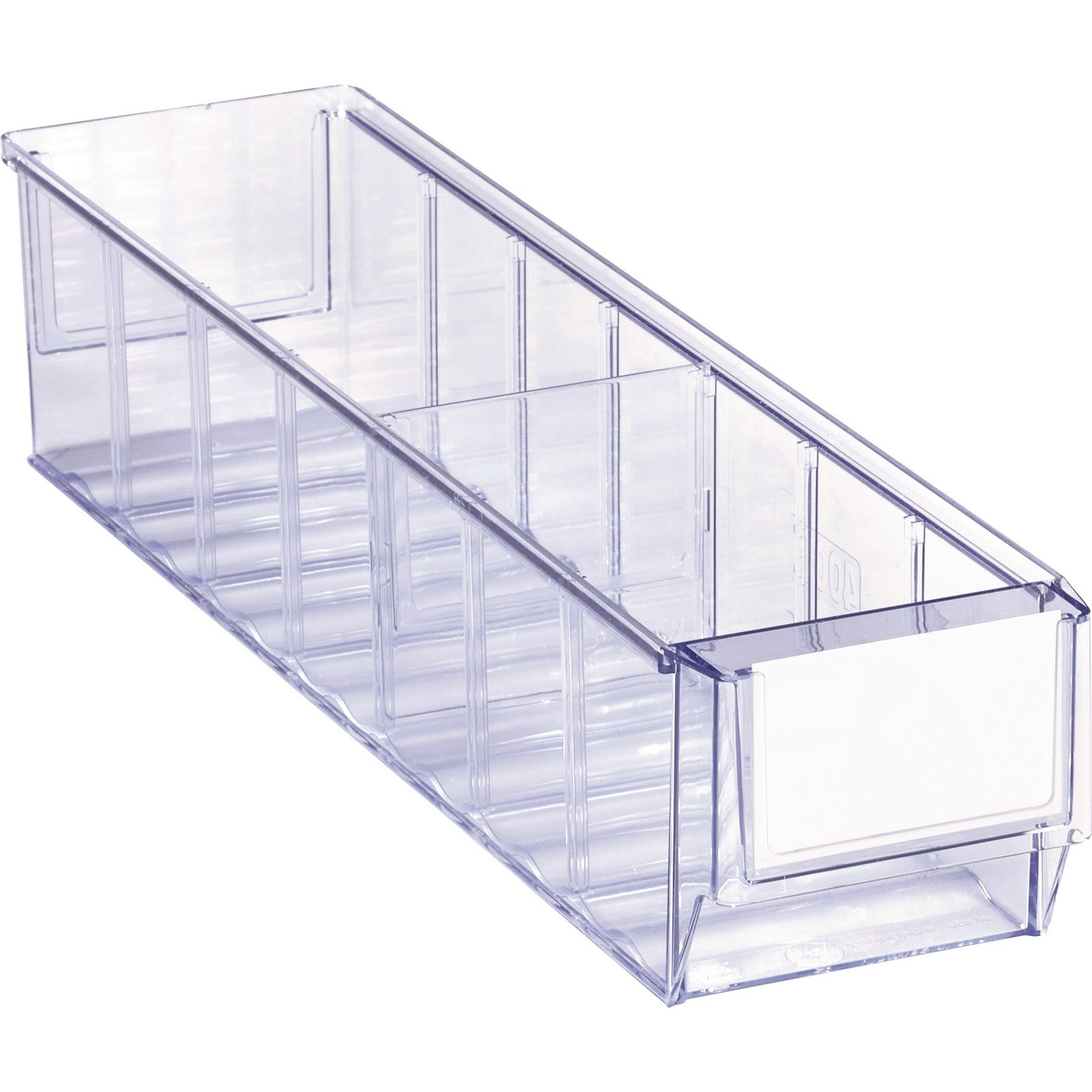 aus SAN · transparent · weitgehend beständig gegen die meisten Säuren und Öle · temperaturbeständig von -20 °C bis +80 °C · gewellter Innenboden für die leichte Entnahme von Kleinteilen · robuste Griffmulde mit großer Fläche für Beschriftungsetiketten (s. Zubehör) · variabel einsetzbar durch umsteckbare Trennwände (s. Zubehör) · die optionale Auszugssperre verhindert das Herausrutschen der Box aus dem Regal