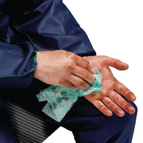 feuchte Handreinigungstücher in mobilem Spender mit Einzeltuchentnahme · intensive Handreinigung ohne Wasser und Seife · immer und überall einsetzbar · der Schmutz wird aufgebrochen, gelöst und im Tuch gebunden · mit Aloe vera als Feuchtigkeitsspender für Ihre Hände eignet sich ideal für den Einsatz in Industrie und Gewerbe, um Hände und Werkzeug effizient zu säubern · VE = 1 Spendereimer à 90 Tücher bzw. Nachfüllpackung à 75 Tücher Weitere technische Eigenschaften: · Ausführung: ohne Einsatz von Wasser · Reinigungsbereich: hartnäckige Verschmutzungen · Gebinde: Spendereimer