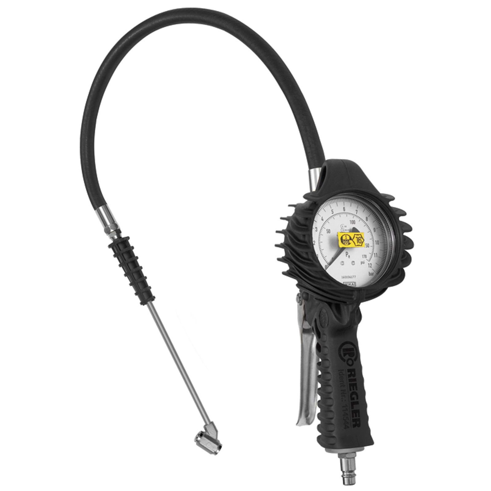 - Robuster Standard-Handreifenfüllmesser mit vollgummierter Schutzhülle, Druckmanometer mit bar- und psi-Anzeige.