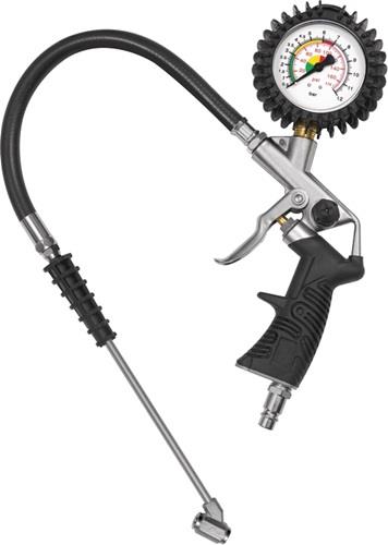 - Robuster Standard-Handreifenfüllmesser mit vollgummierter Schutzhülle, Druckmanometer mit bar- und psi-Anzeige.