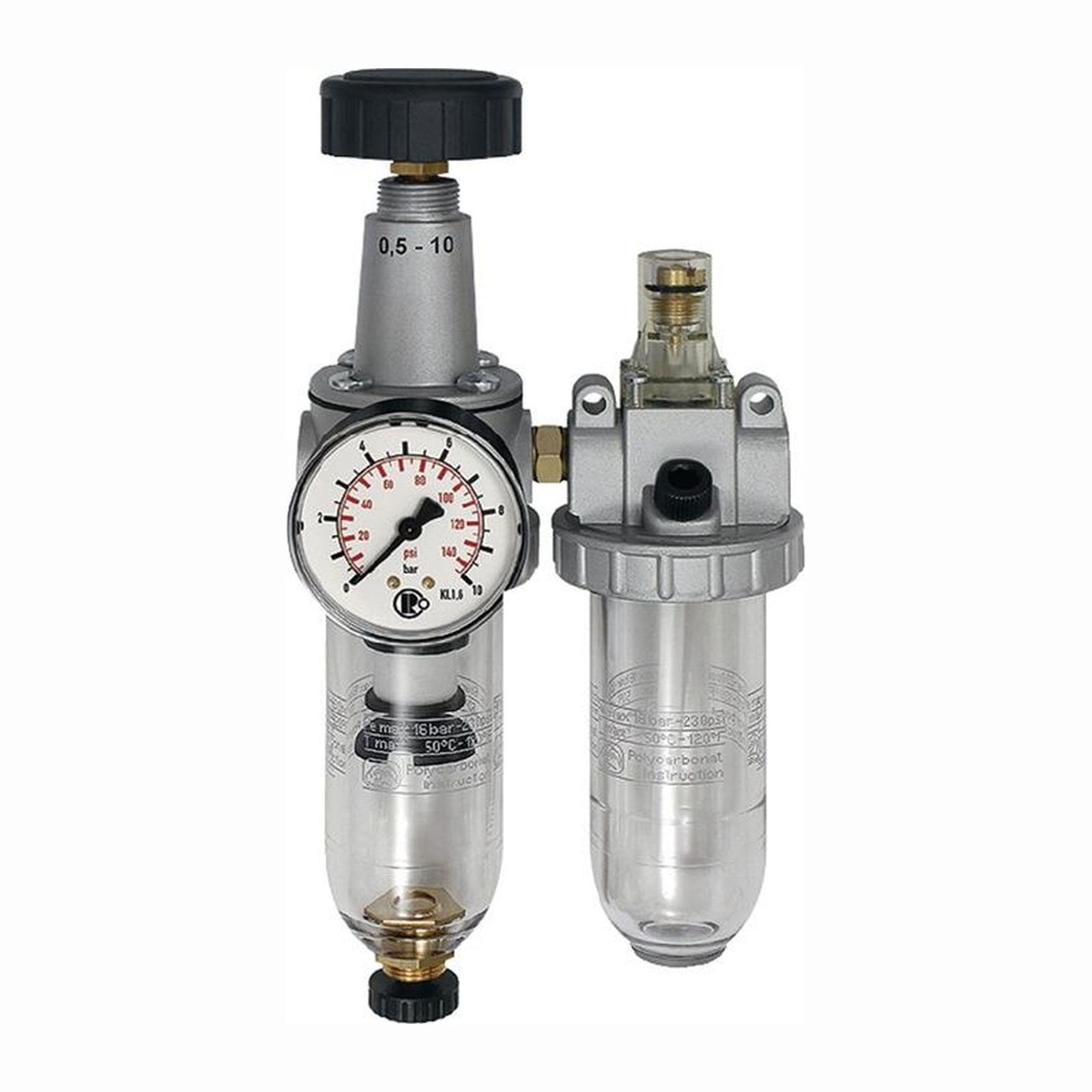 - Zweiteilige Wartungseinheiten, bestehend aus einem vordruckunabhängigen, rücksteuerbaren Membrandruckregler mit Sekundärentlüftung in Verbindung mit einem Zentrifugalabscheider und einem Proportionalöler.