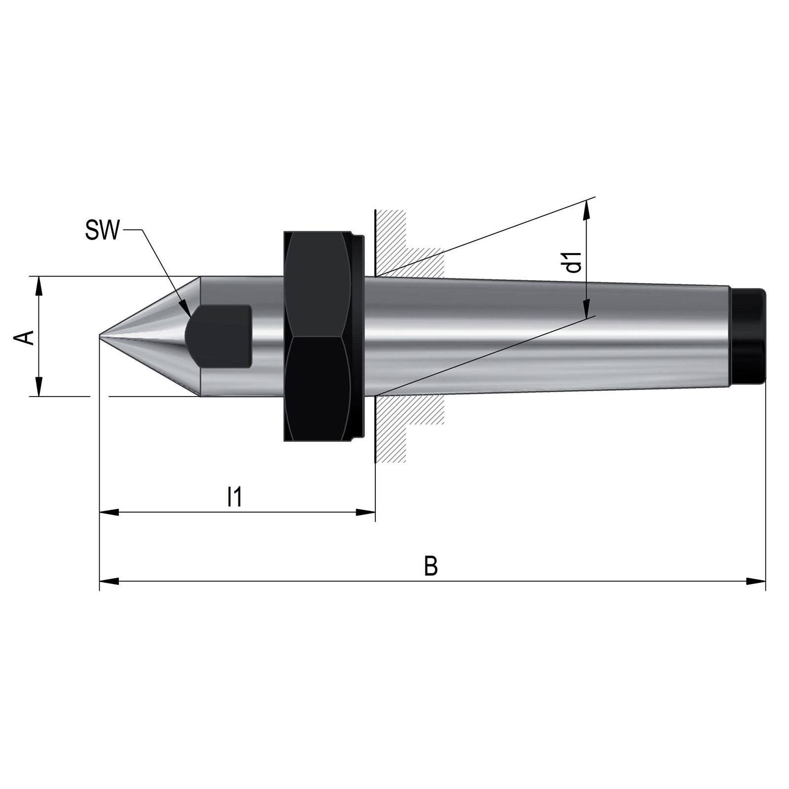 - Feste Zentrierspitzen, Aufnahme MK 4, ähnlich DIN 807, volle Spitze mit Abdrückmutter und SW Werkstoff: WS