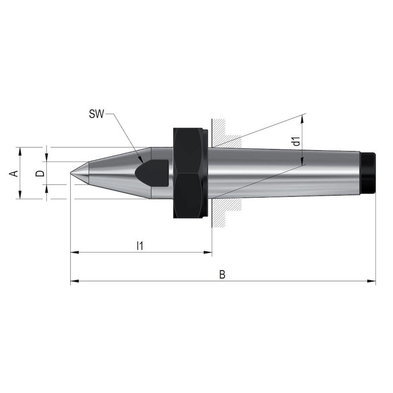 - Feste Zentrierspitzen, Aufnahme MK 6, ähnlich DIN 807, volle Spitze mit Abdrückmutter und SW, mit verlängerter Spitze Werkstoff: WS