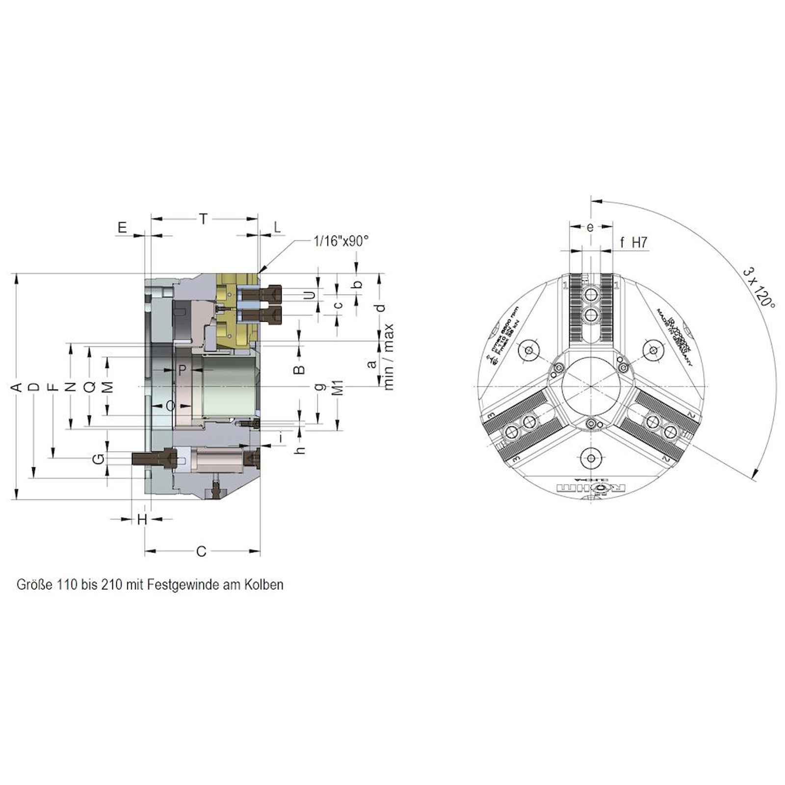 Grundkörper aus Stahl;Dauerhauft konstante Spannkraft über 500.000 Zyklen;Keilhakenprinzip;Fest verbaute Grundbacke, Aufsatzbacken über Nutensteine;Gewindering fertig vorbereitet;Rundlaufgenauigkeit: 0,01 (bei ausgeschliffenen Aufsatzbacken);Lieferumfang: Futter, Befestigungsschrauben für Futter, Nutensteine inkl. Befestigungsschrauben (ohne Aufsatzbacken)Einsatzbereiche: