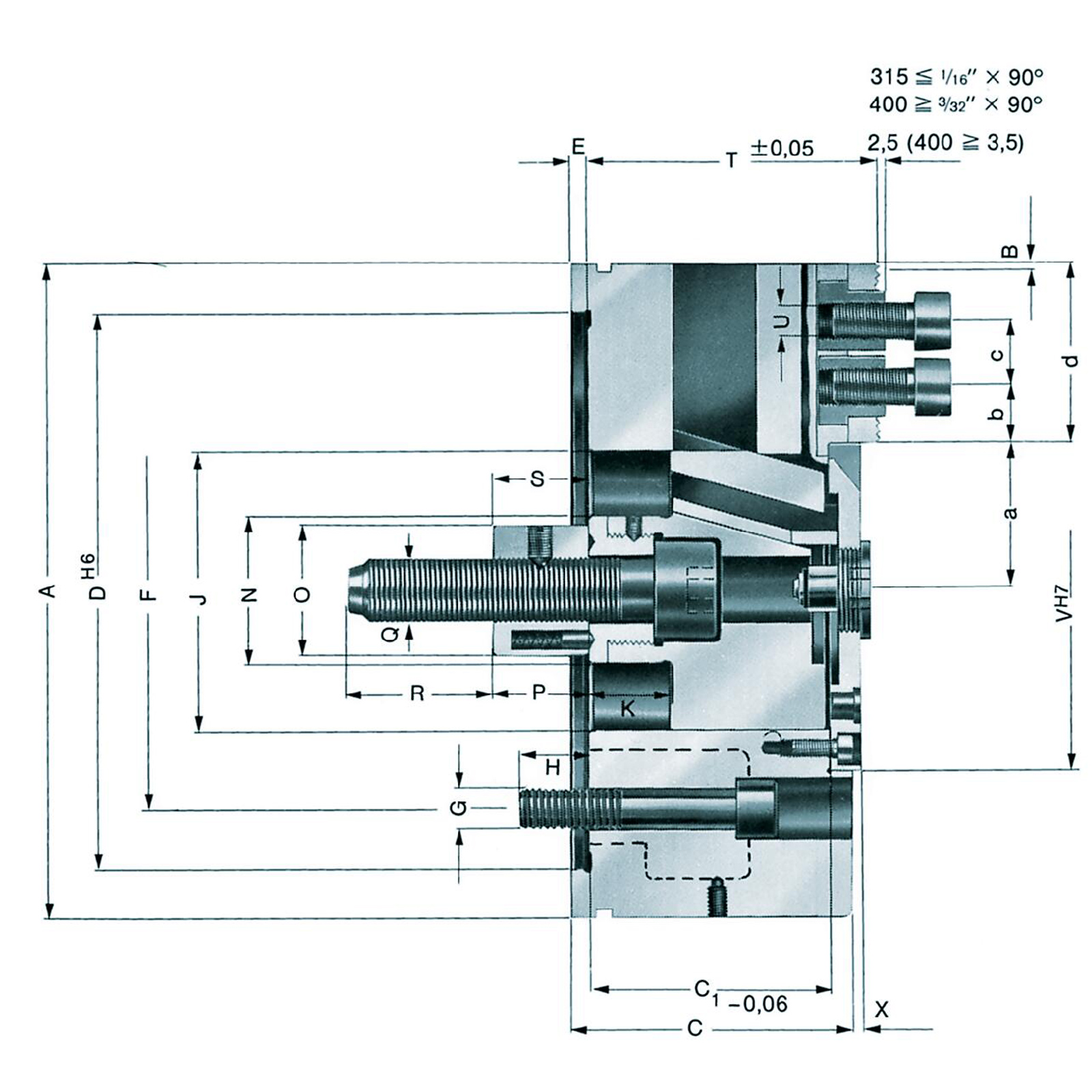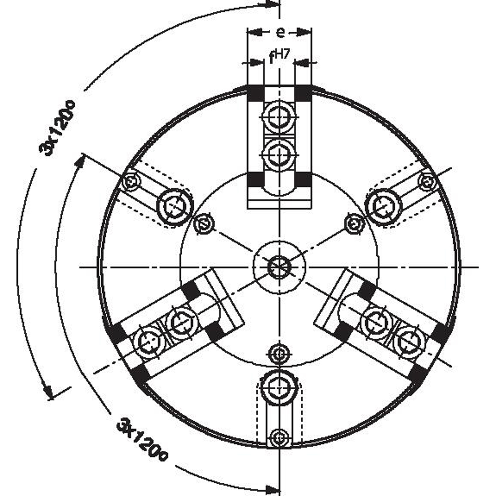 - Kraftspannfutter ohne Durchgang KFD, Größe 130, 3-Backen, Standardausführung, Spitzverzahnung 90° Zylindrische Zentrieraufnahme, Anschlussmaße nach DIN 6353
