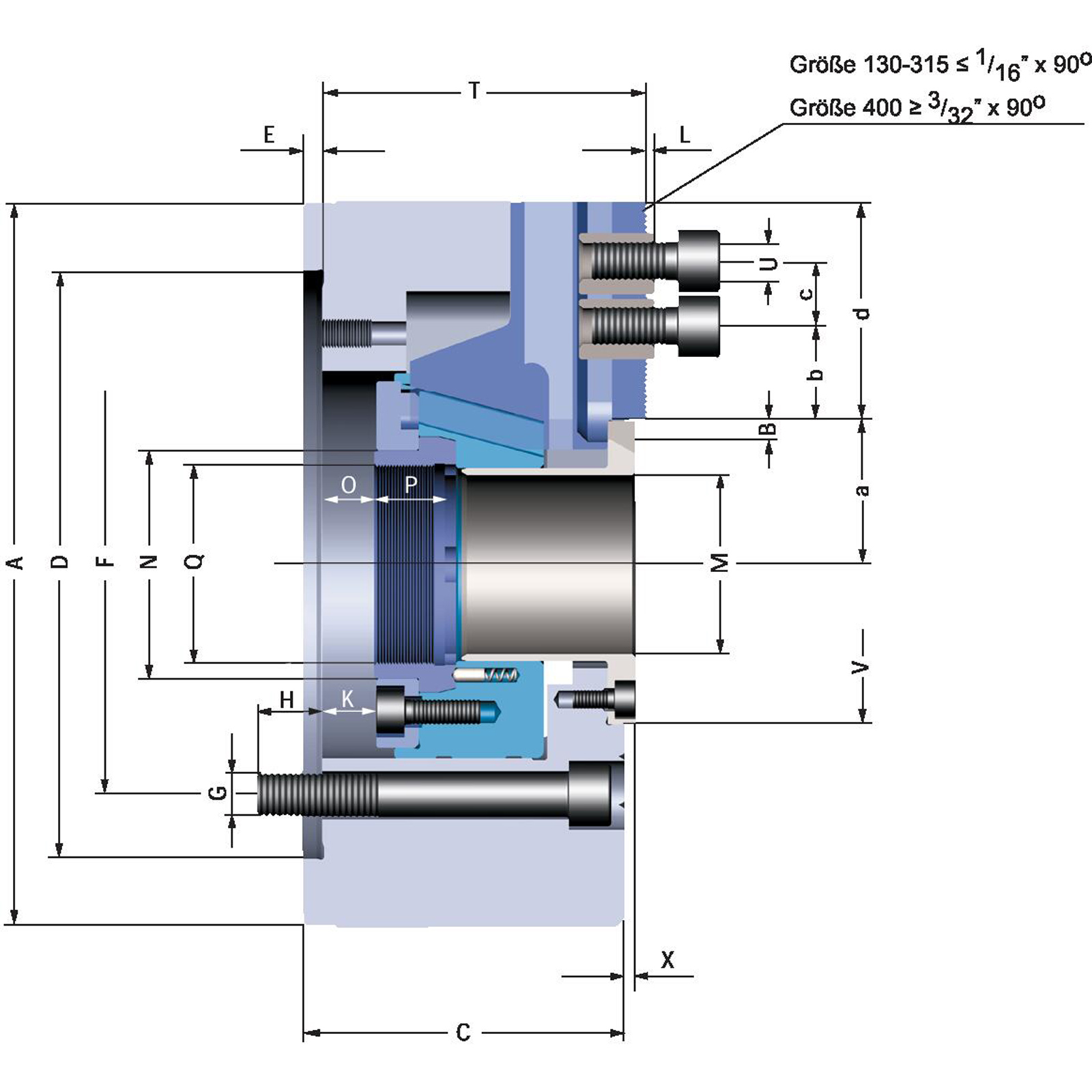 - Kraftspannfutter mit großem Durchgang KFD-HE, Größe 315, 3-Backen, Spitzverzahnung 90° Zylindrische Zentrieraufnahme, Anschlussmaße nach DIN 6353