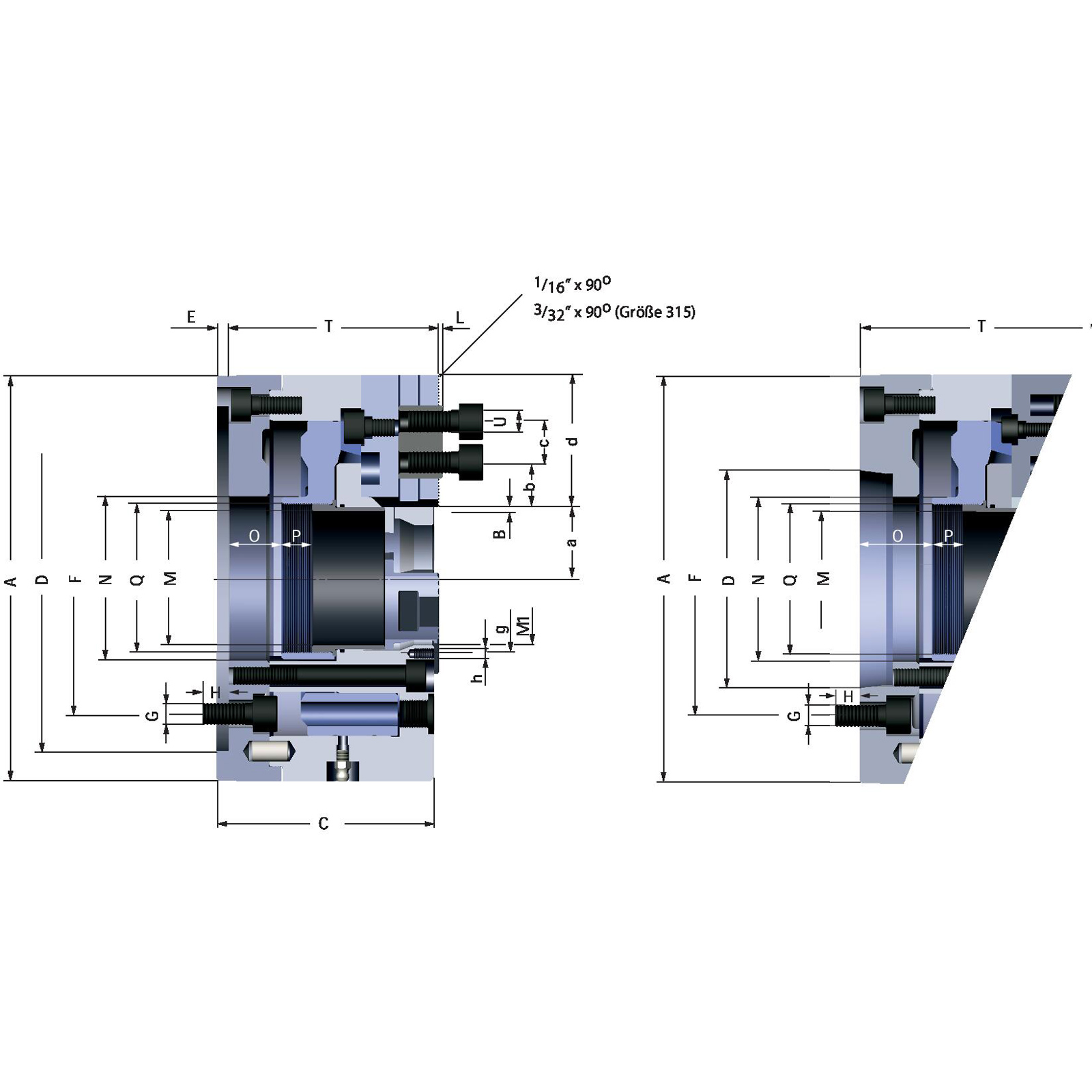 - Kraftspannfutter mit zylindrischer Zentrieraufnahme oder Kurzkegelaufnahme erhältlich.