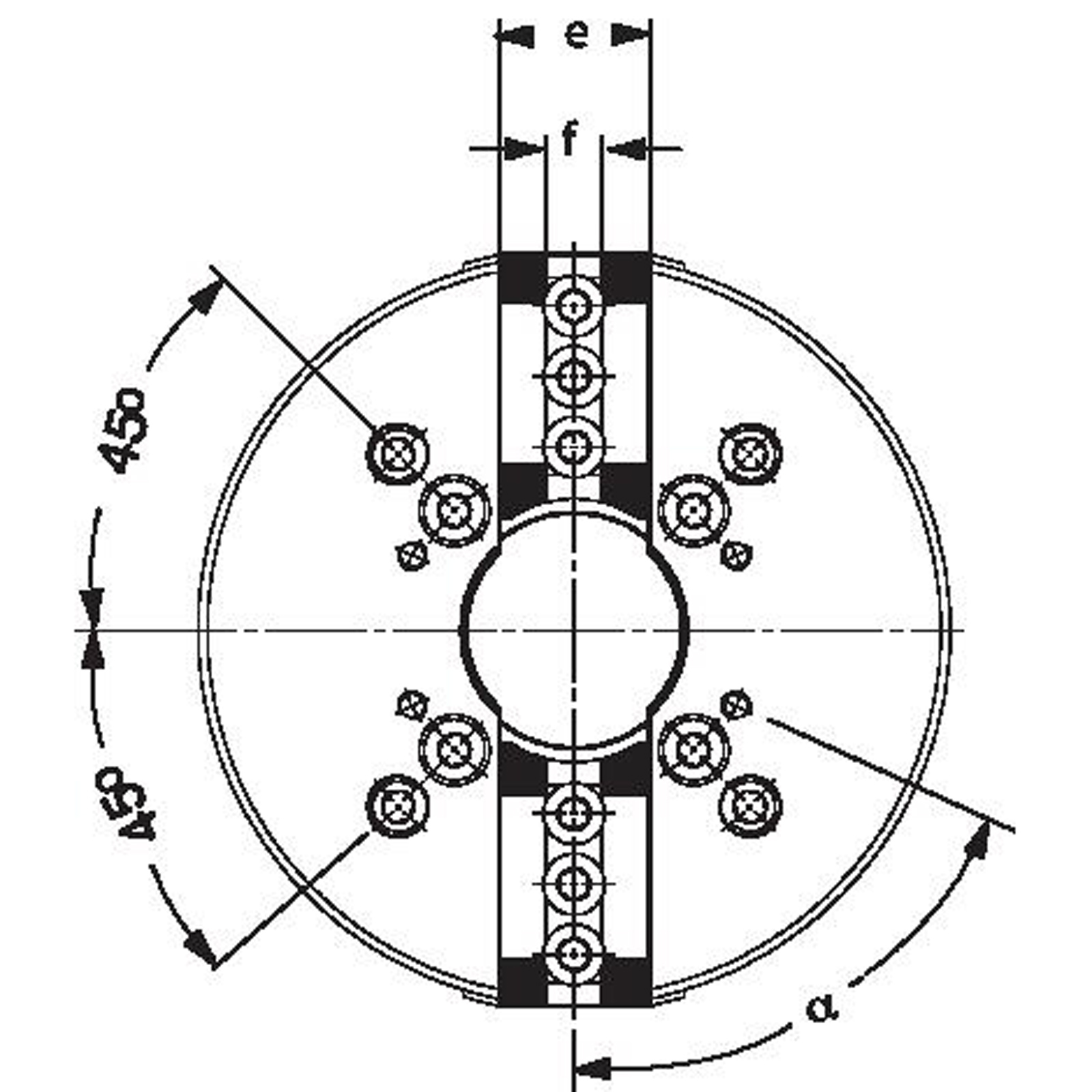 - Kraftspannfutter mit Durchgang KFD-HS, Größe 250, 2-Backen, Spitzverzahnung 90°, Zylindrische Zentrieraufnahme, Anschlussmaße nach DIN 6353