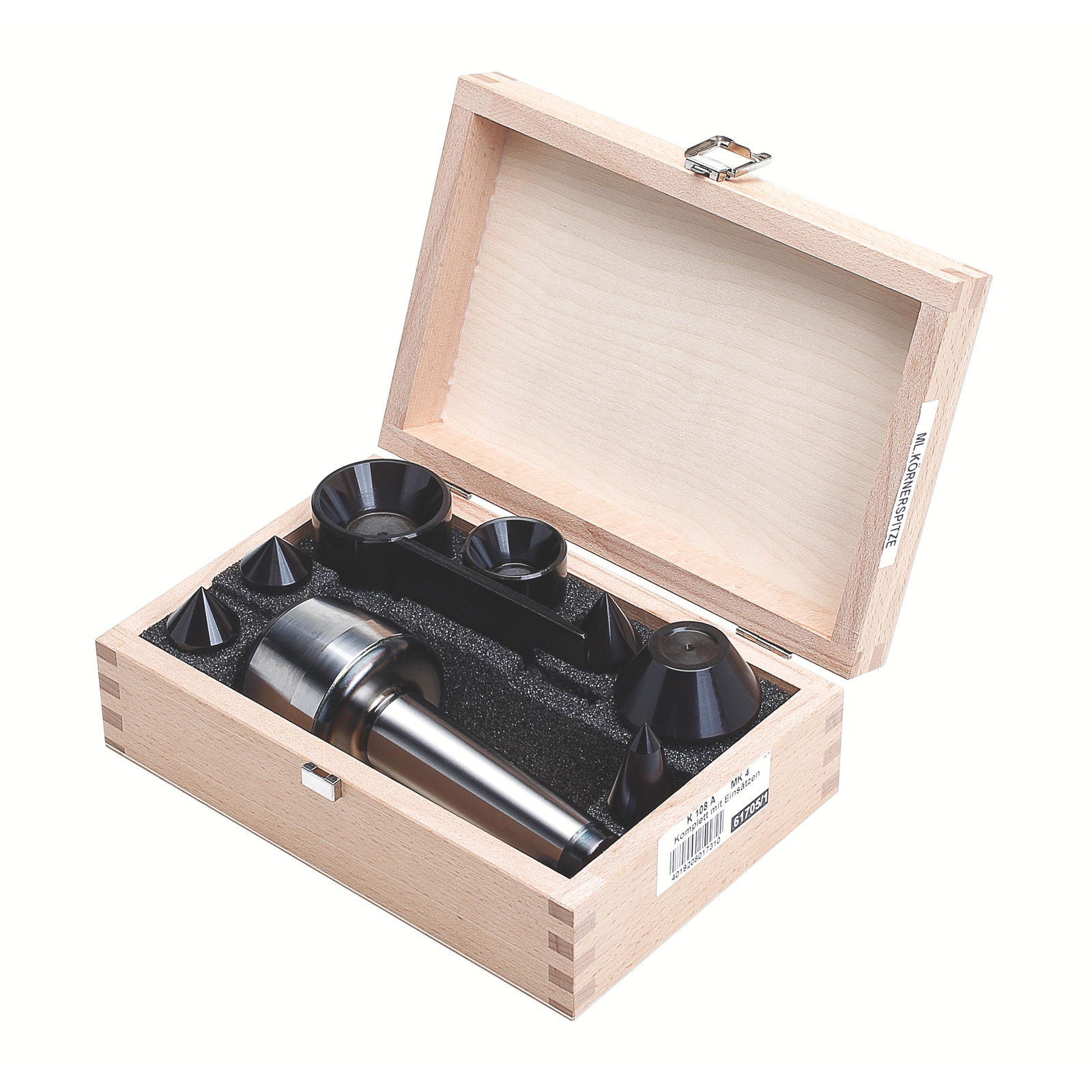 - Mitlaufende Zentrierspitze, Aufnahme MK 3, Größe 104, komplett mit allen Einsätzen im Holzkasten
