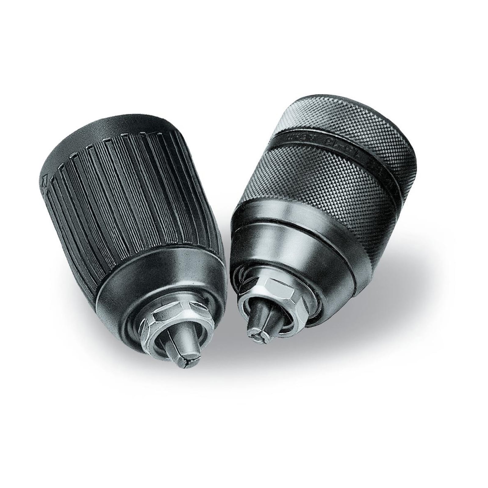 - Schlagbohrfestes Schnellspann-Bohrfutter mit Radialverriegelung und Kunststoff- oder Metallhülse.
