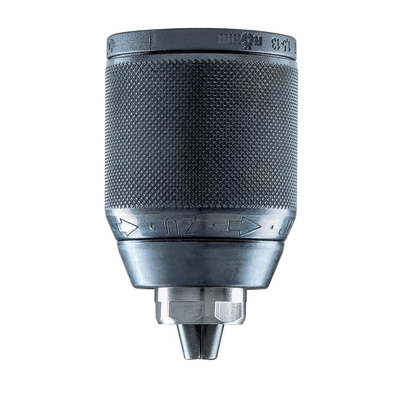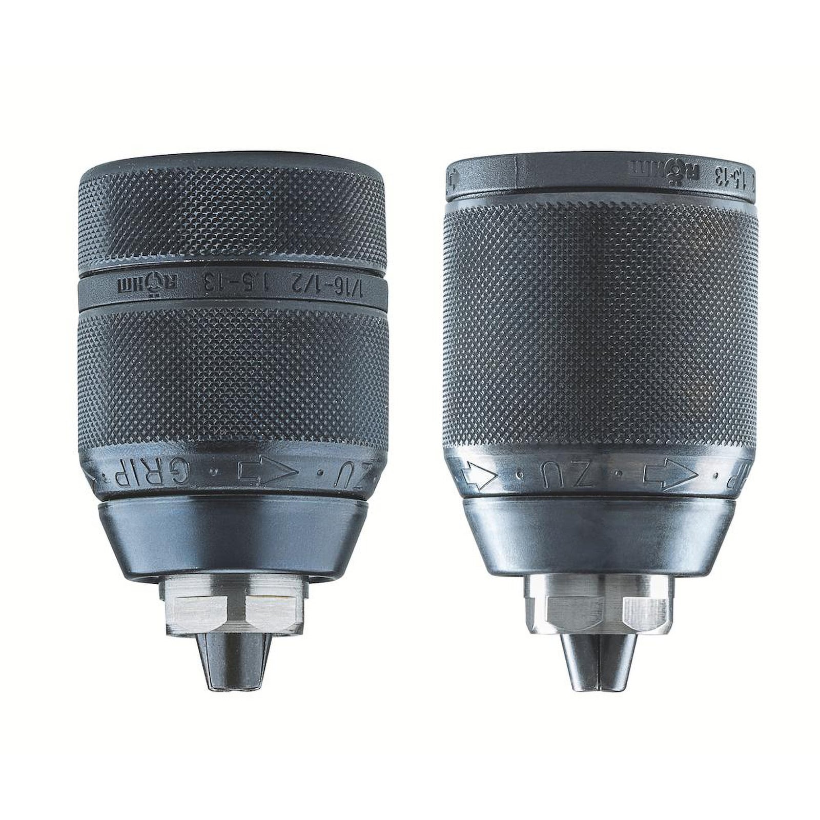 - Schlagbohrfestes Schnellspann-Bohrfutter mit Radialverriegelung und Kunststoff- oder Metallhülse.
