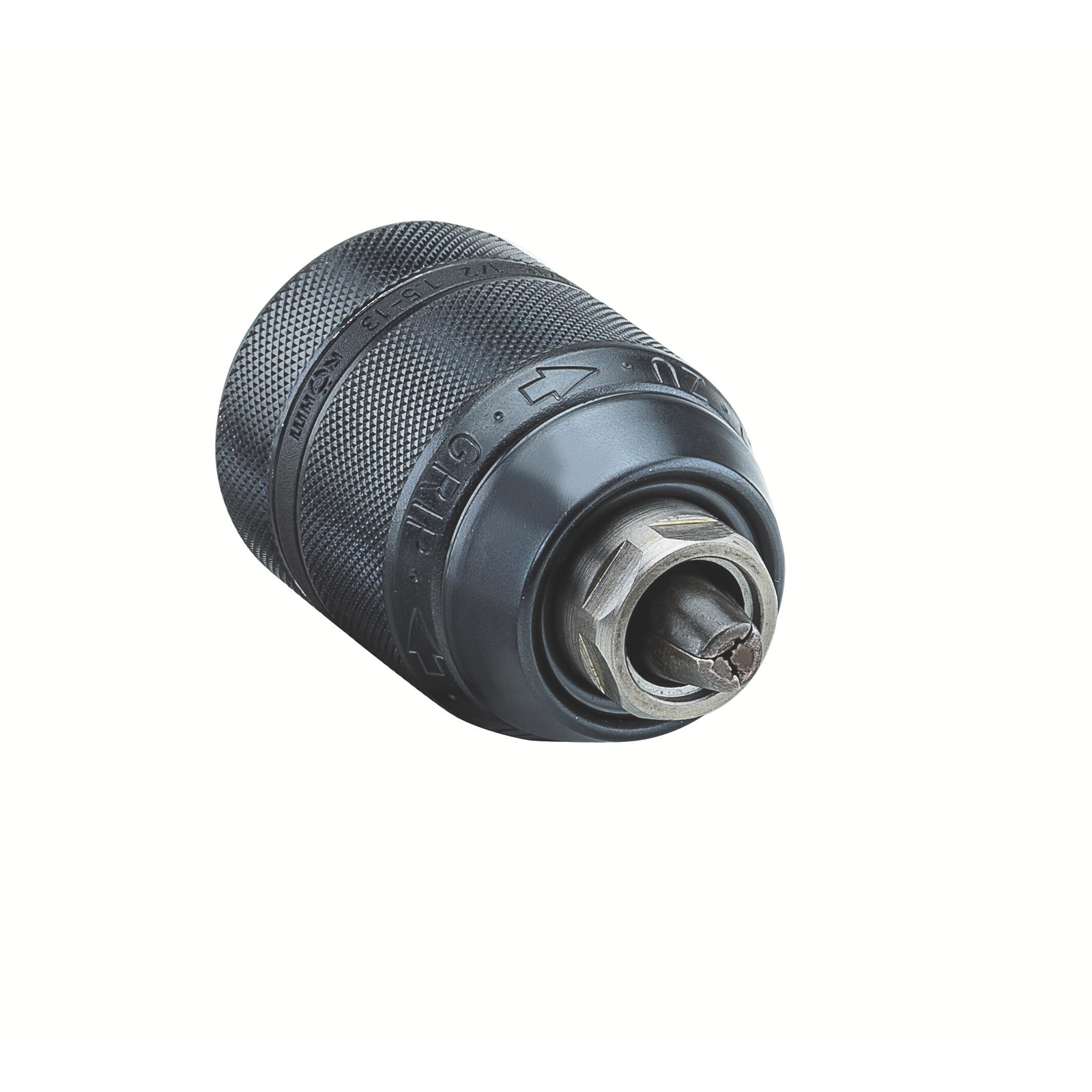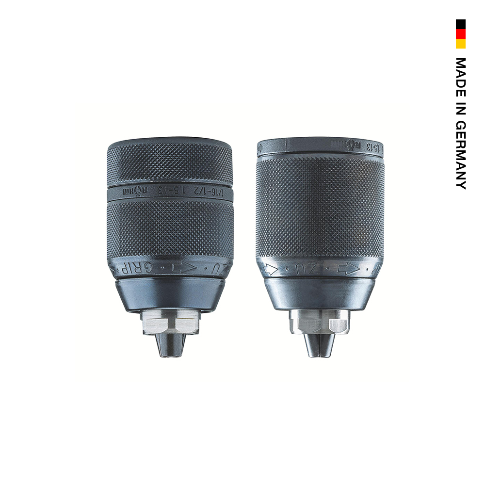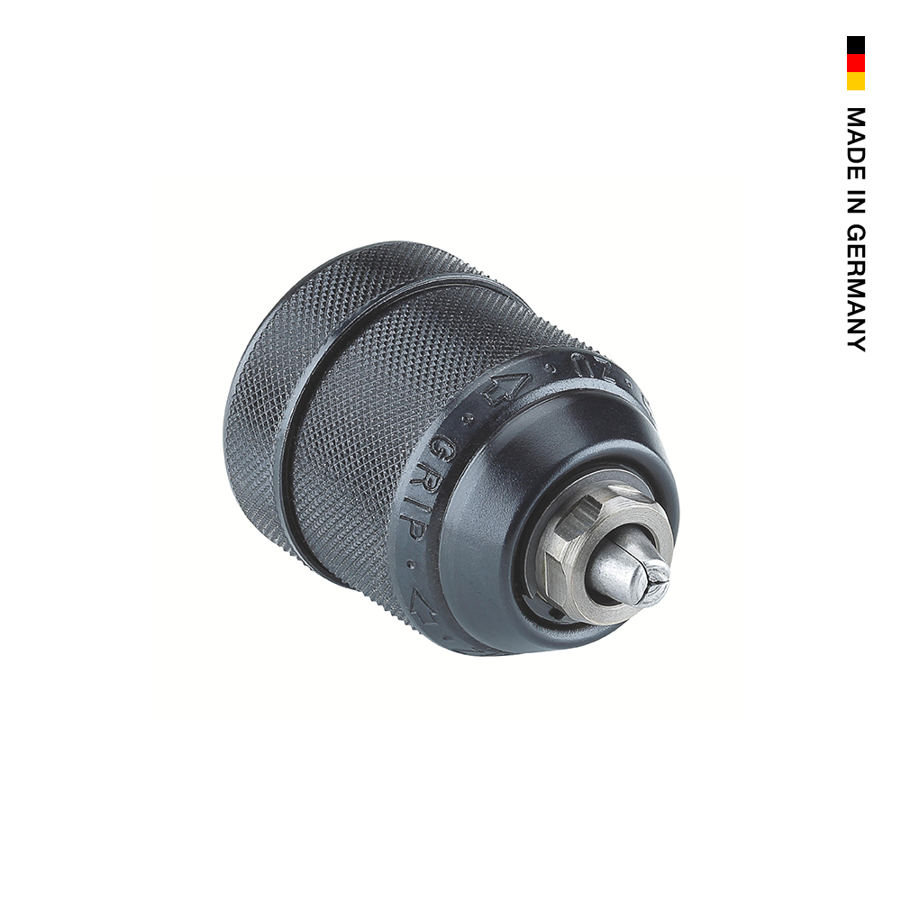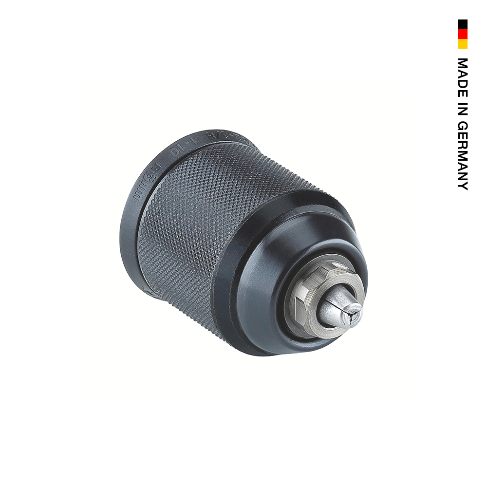 - Schlagbohrfestes Schnellspann-Bohrfutter mit Radialverriegelung und Kunststoff- oder Metallhülse.