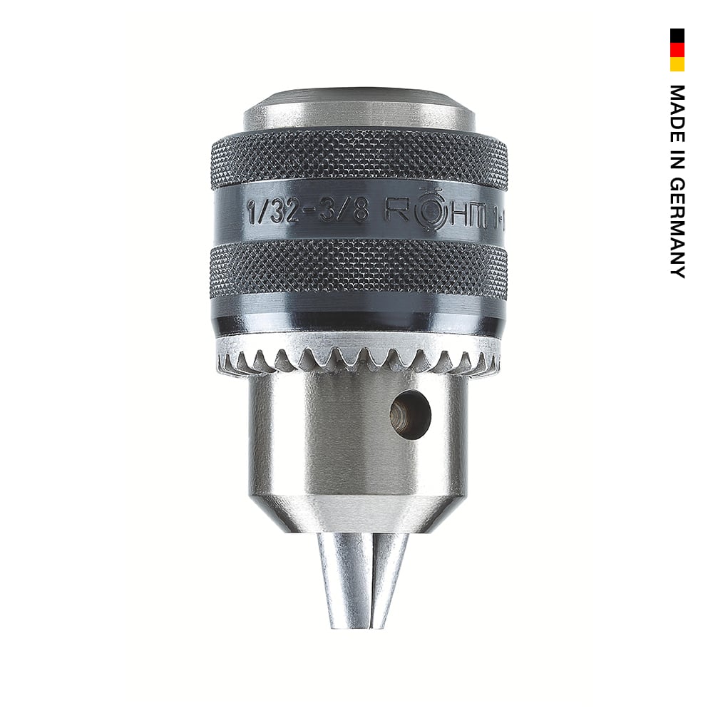 - Schlagbohrfestes Zahnkranz-Bohrfutter mit Schlüssel. Konus- bzw. Gewindeaufnahme gemäß DIN ISO 10887 (Verzahnung nach DIN 6349).