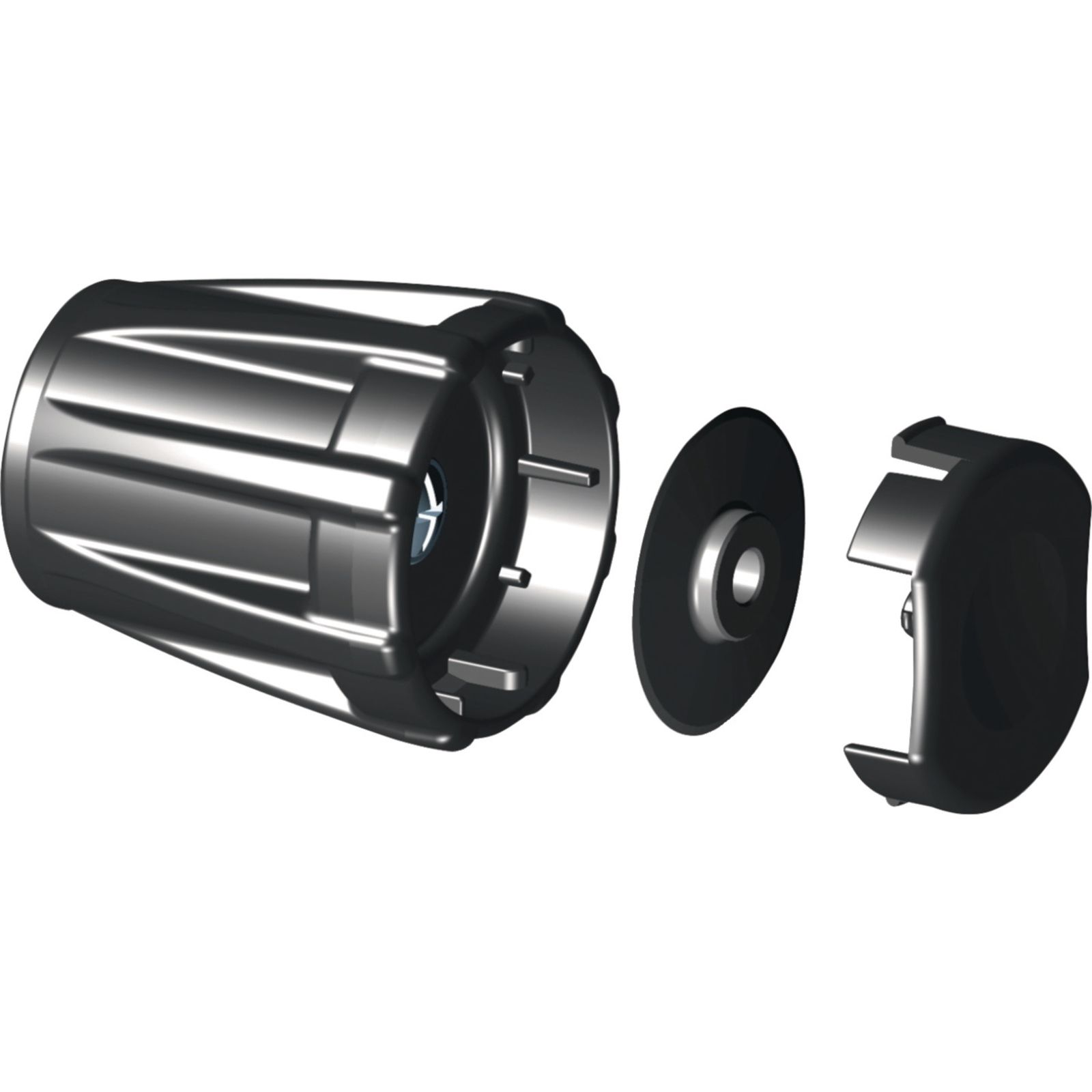 zum Schneiden von Kunststoffrohren · Körper aus Aluminium-Druckguss · Schlitten und Drehknauf aus Zink-Druckguss · mit 2 Schneidrädern · 1 montiert + 1 Ersatzschneidrad im Drehknauf-Kappe · mit ICS-System · Schneidradwechsel ohne Werkzeug · mit 4 Führungsrollen · mit Schnellvorschub · integrierte NOGA-Entgraterklinge · kann komplett herausgezogen werden · ergonomischer Drehknauf · Schneidrad aus DIN 42CrM04-Stahl, schwarz, Ø 30 mm · pulverbeschichtet Weitere technische Eigenschaften: · Anwendungsbereich: Kunststoff- und Verbundrohre