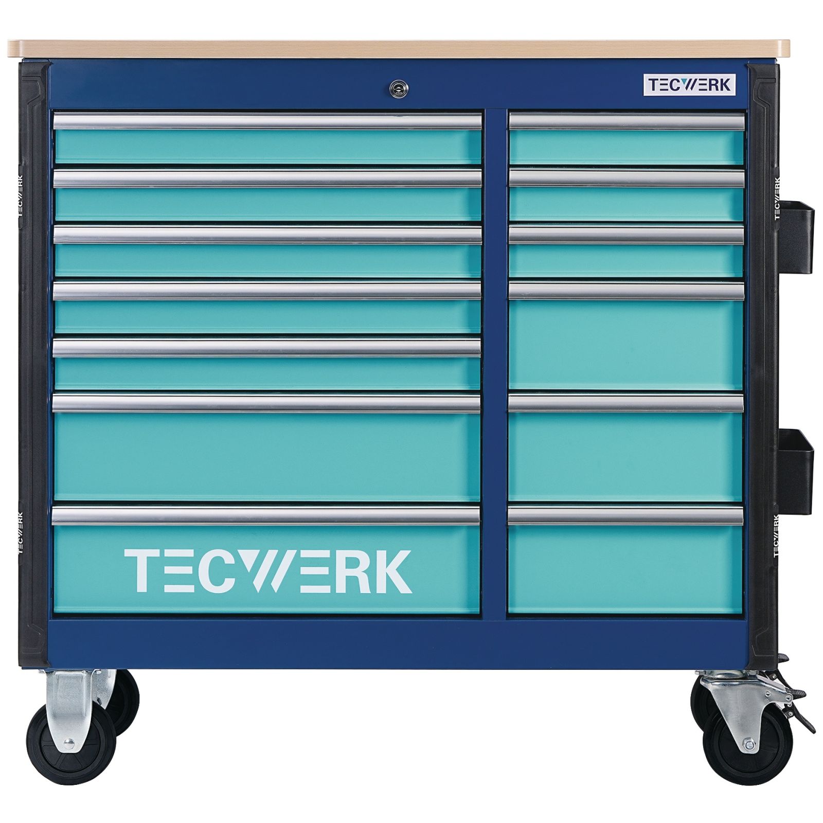 mit 13 Schubladen · Handgriff · kugelgelagerten, mit Teleskopschienen herausziehbaren Schubladen mit 100 % Auszug mit jeweils einer Antirutschmatte · automatischer Schubladeneinzug · beschriftbare Schubladen · robuste Ablagefläche bestehend aus einer 25 mm dicken MDF Platte · Einteilerset für 4 Schubladen im Lieferumfang enthalten · mit Zentralverriegelung (nur eine Schublade gleichzeitig geöffnet) · abschließbar mittels eingebauten Zylinderschloss mit 4 Schlüsseln · hochwertige PVC-Rollen Ø 127 mm - 2 starre und 2 lenkbare Rollen mit Feststellung · beidseitiges Lochwandsystem (9 x 9 mm) · für einfache Installation von Zubehörartikel · 2 Dosenhalter mit Lochung für Schraubendreher (im Lieferumfang enthalten) · durchgehender, seitlicher Kantenschutz Maß über alles aufgebaut mit Griff und Rädern (B x T x H) 1090 x 500 x 1055 mm Maß nur Korpus (B x T x H) 1042 x 459 x 885 mm Innenmaß Schubladen (B x T x H) 5 x 568 x 398 x 75 mm, 2 x 568 x 398 x 154 mm, Innenmaß Schubladen (B x T x H) 3 x 290 x 398 x 75 mm, 3 x 290 x 398 x 154 mm Die schmalen Schubladen sind nicht passend zum TECWERK Modulsystem Tragkraft pro Schublade 30 kg / statische Gesamtbelastbarkeit 500 kg Weitere technische Eigenschaften: · Anzahl Längsteiler: 8 · Plattenstärke: 25mm · Anzahl Querteiler: 8 · Schubladen: 6
