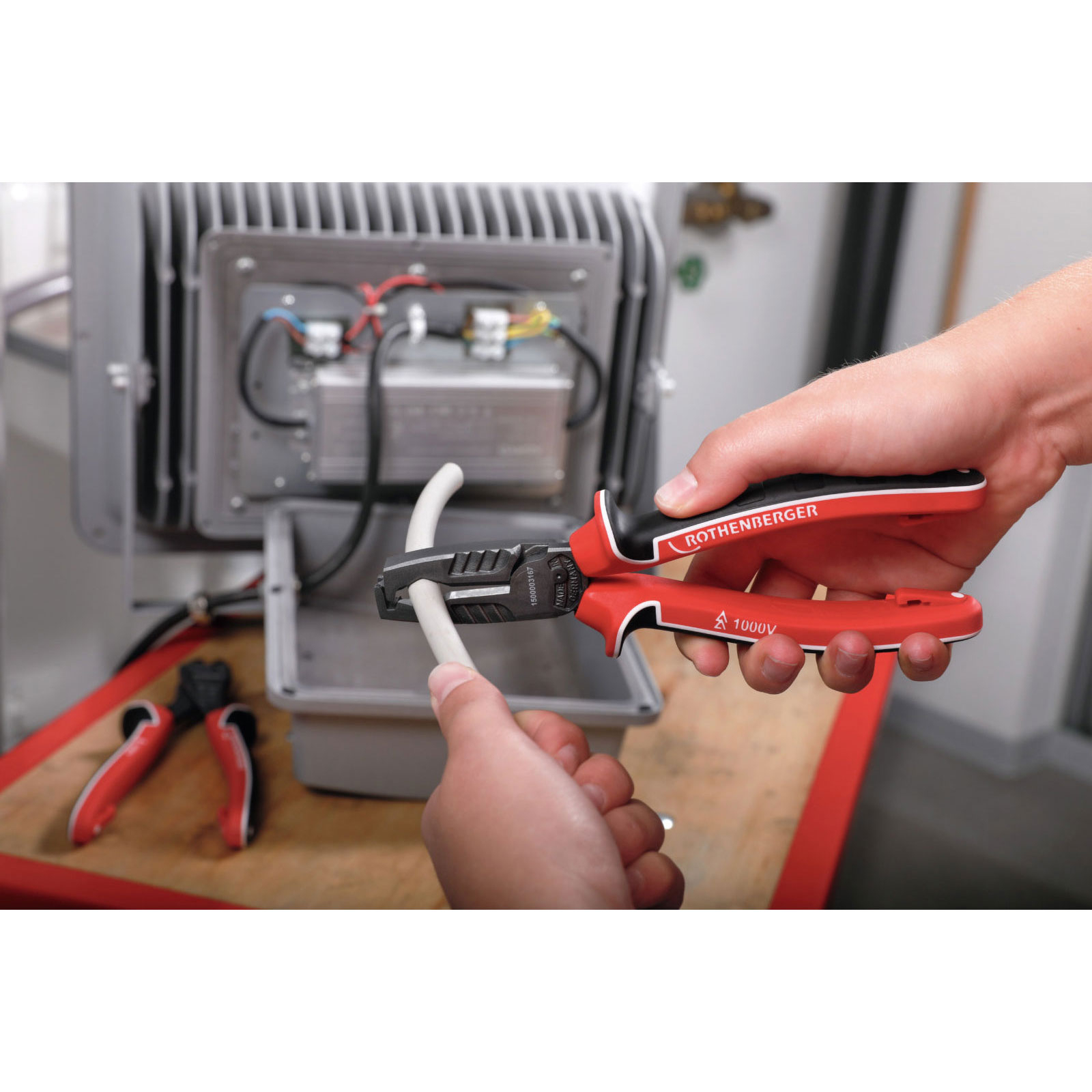 In der Abisolierzange ist ein Ringschlüssel zum Anziehen oder Lösen von Schrauben der Größe M8 bis M10 integriert. Die induktiv gehärtete Schneide kann Drähte oder Kabel leicht abzwicken und mit der asymmetrischen Greiffunktion werden Rund- und Flachmaterial einfach gegriffen. In der Einkerbung am Zangenknopf können unterschiedliche Drahtdurchmesser eingeklemmt und gebogen werden.