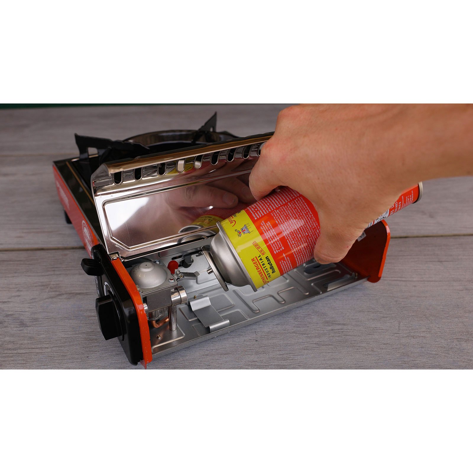 - Dank der Kartuschensicherung (Hebel neben dem Gasregler) kann die Gaszufuhr unterbrochen und wiederhergestellt werden.