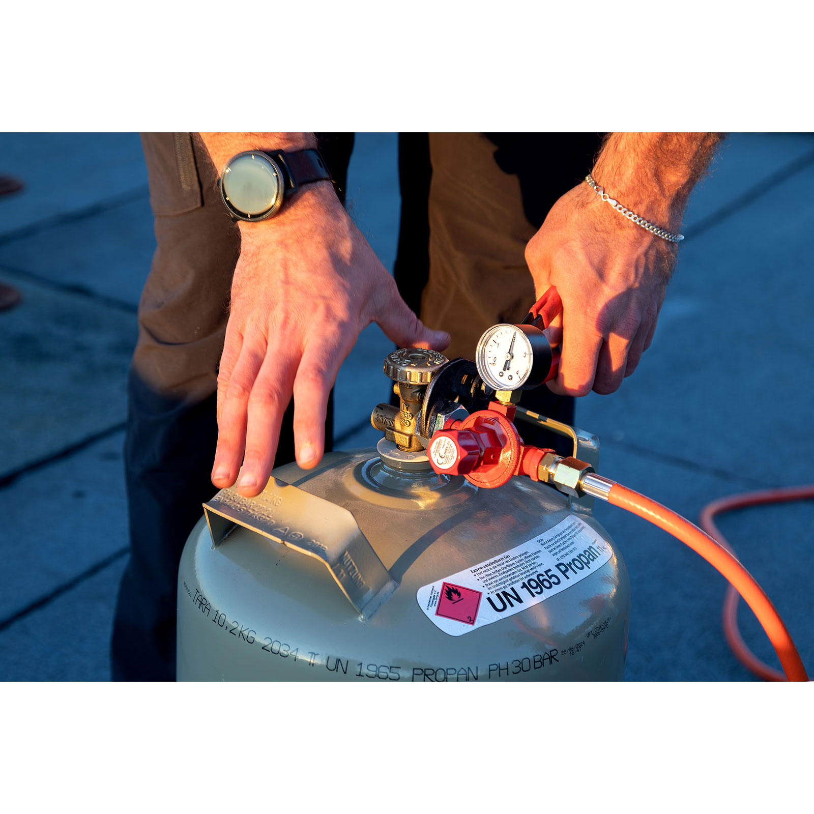 - Für Propangasflaschen 5 kg, 11 kg, 33 kg und Gaslötgeräte mit Schlauchanschluss G 3/8“ L