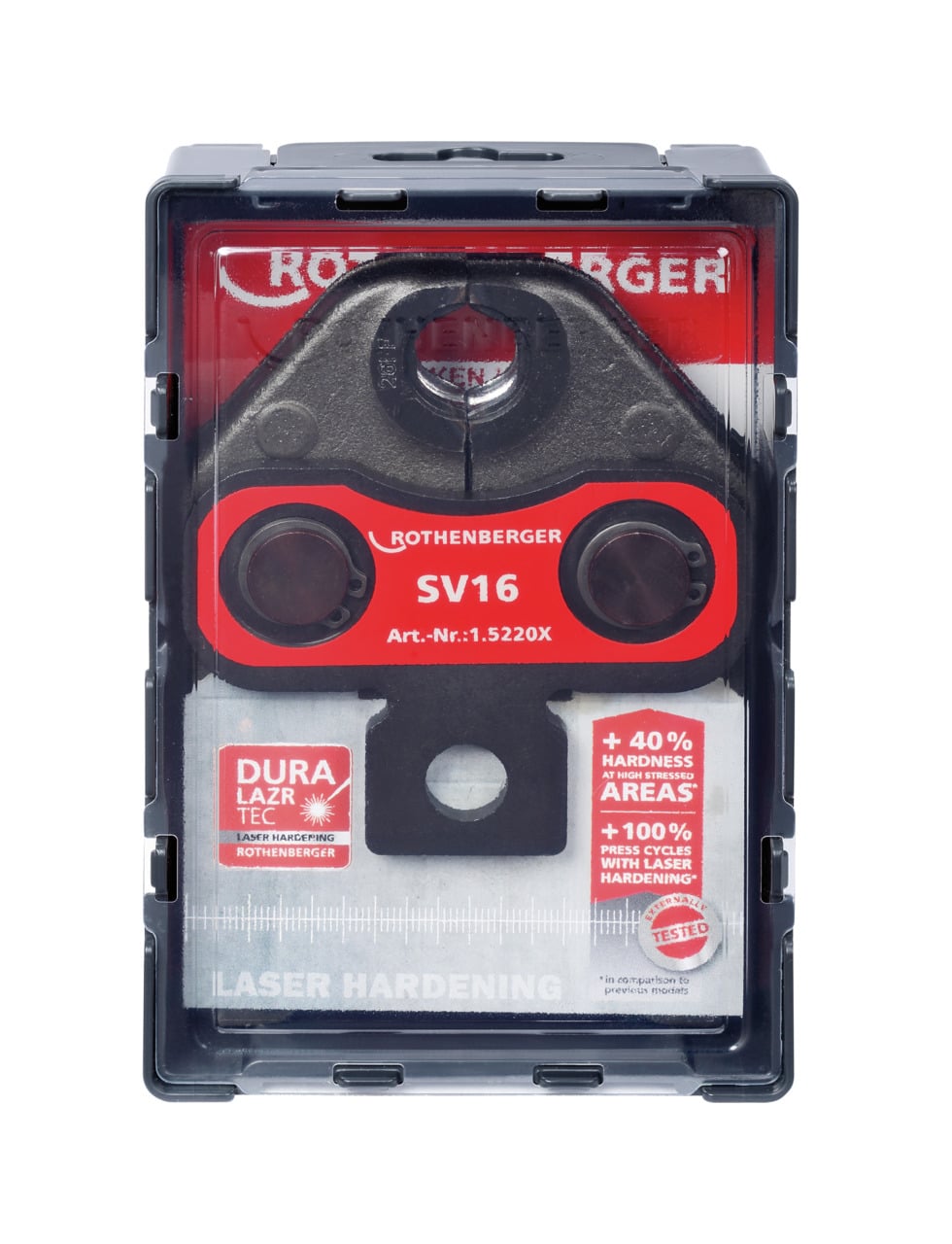 Die ROTHENBERGER Standard Pressbacke der Kontur SV mit Nennweite von 16 mm eignet sich ideal zum systemkonformen Verpressen von Fittings für metallische Rohrleitungssysteme.Merkmale
