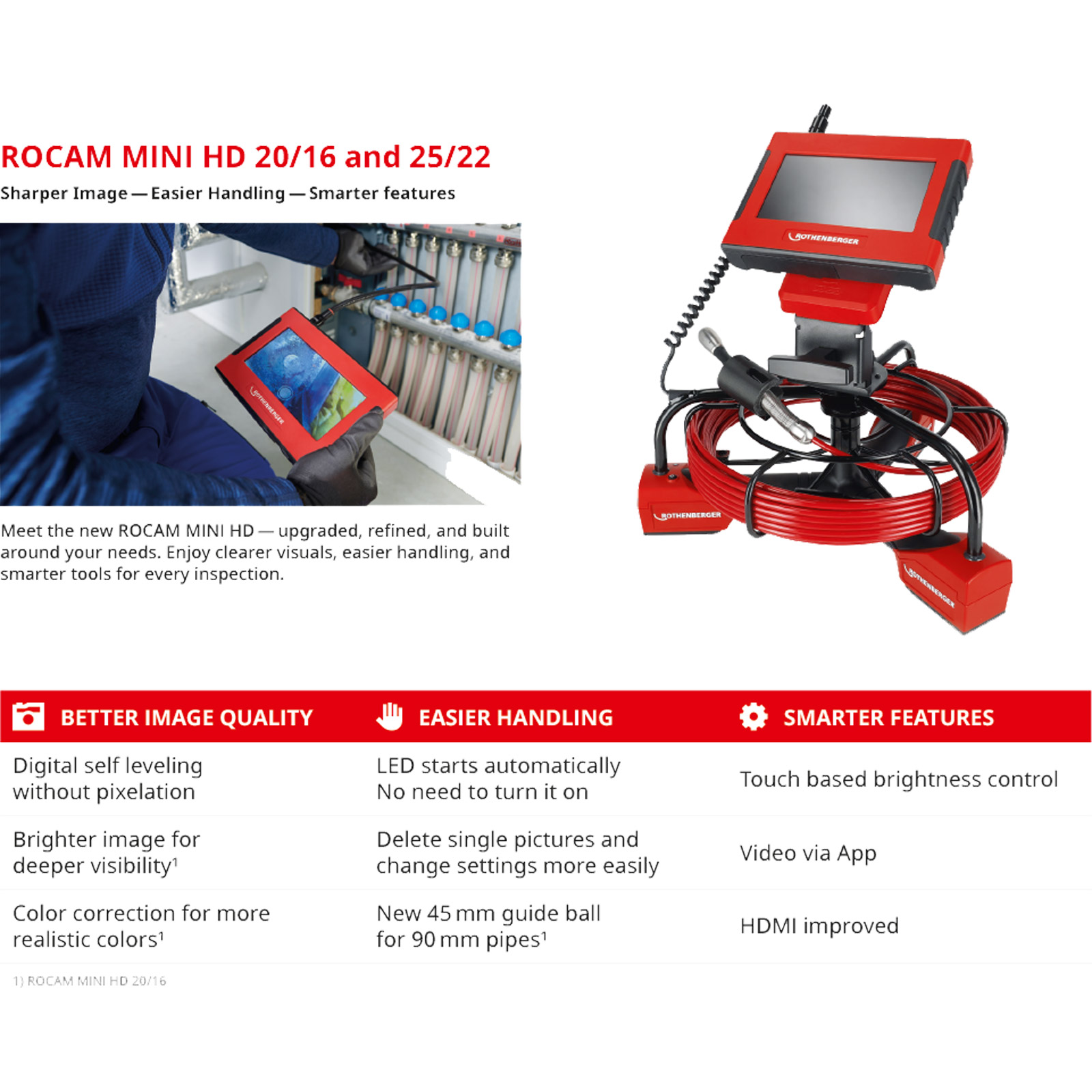 Das ROCAM mini HD - Modul 25/22 HD ist das Nachfolgeprodukt des ROSCOPE i2000. Sie ist auf die Inspektion von Rohren im Haus- und Wohnbereich mit Rohren von Ø40-110mm ausgelegt. Das qualitativ hochwertige HD-Bild ermöglicht eine präzise Inspektion und vereinfacht die Analyse des Sachbestands. Am Gerät selbst kann die Leckage oder Verstopfung im Bild direkt gekennzeichnet werden. Das spart Zeit in der Nachbearbeitung. Auch dank der App-Kompatibilität kann via Live Stream der Kunde über die eigene Arbeit in Kenntnis gesetzt werden sowie Daten schnell und einfach weitergeleitet werden. Dank 22m Kabellänge und dank einer optimierten Kabelsteifigkeit können auch mehrstöckige Familienhäuser in einem Inspektionsvorgang inspiziert werden. Damit bleibt aufwendige Rüstzeit erspart.