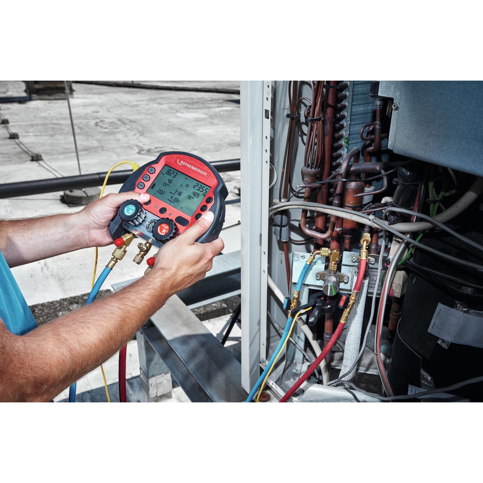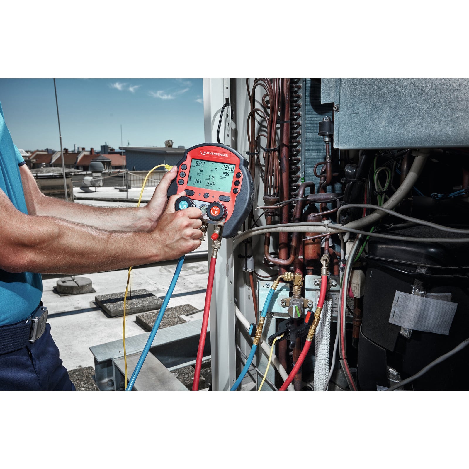 - Die Rothenberger ROCOOL 600 ist eine modular aufrüstbare digitale Monteurhilfe. Mit diesem Set inklusive Grundgerät und zwei Temperaturklemmen im Koffer lassen sich bereits die Vorzüge einer digitalen Monteurhilfe nutzen; wie z.B. die automatische Berechnung der Überhitzung und eine Auswahl von über 80 Kältemitteln. Damit dient sie insbesondere der Installation von Klimaanlagen und Wärmepumpen. Sobald Aufzeichnungen der Anlagenwerte erstellt werden sollen, kann das Gerät mit einem externen Speicher inklusive PC-Software erweitert werden. Für Messungen im Hochvakuum ist eine Pirani-Vakuumsonde verfügbar.