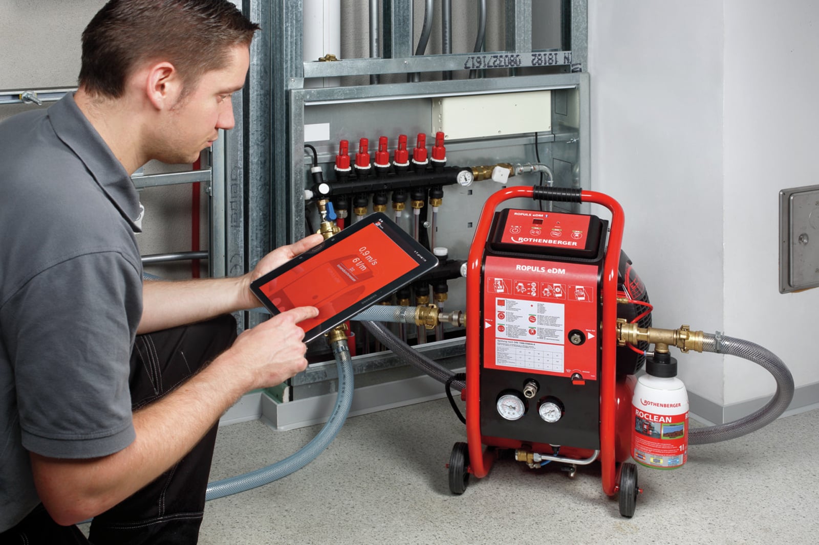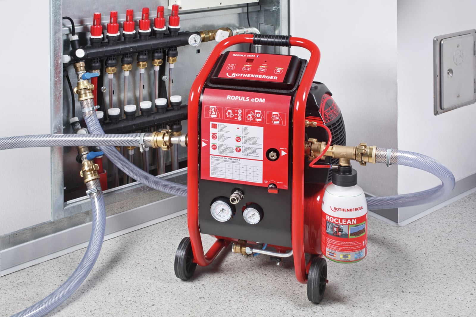 Für Installateure und Anwender im Gebäudeservice eignet sich der ROPULS eDM Spülkompressor optimal zum Reinigen und Entschlammen von Heizkreisen, zum Spülen von Trinkwasserleitungen gemäß DIN 1988-2/EN 806-4 und zum Desinfizieren von Trinkwasserleitungen. Ein mittels App erstelltes Spülprotokoll kann sofort als PDF mit Firmenkopf und allen relevanten Daten per Mail versandt werden.
