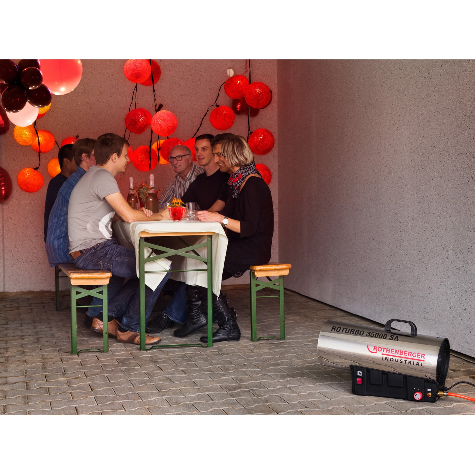 Die stufenlos regelbare ROTHENBERGER Industrial Heizkanone ROTURBO 35000SA eignet sich hervorragend für Räumlichkeiten ab 300 m³. Ob auf Baustellen oder in wettergeschützten Außenbereichen wie Zelten, Marktständen und gut belüfteten Räumen, diese Heizkanone überzeugt durch ihre Leistungsfähigkeit und Zuverlässigkeit.