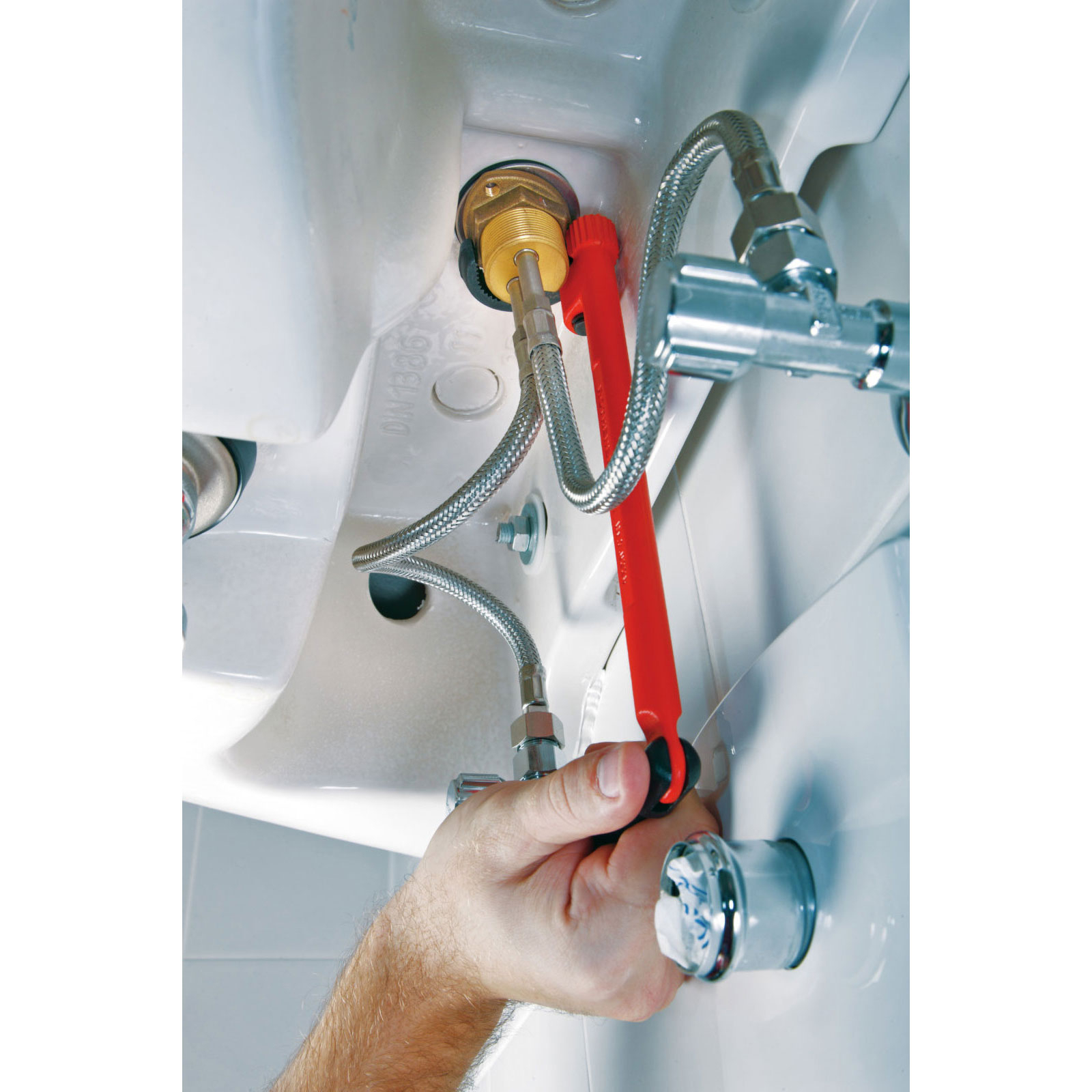 Der Standhahnmutternschlüssel ist ideal zum Festziehen und Lösen von Schraubenmuttern an schwer zugänglichen Stellen wie Waschtischen und Spülbecken.