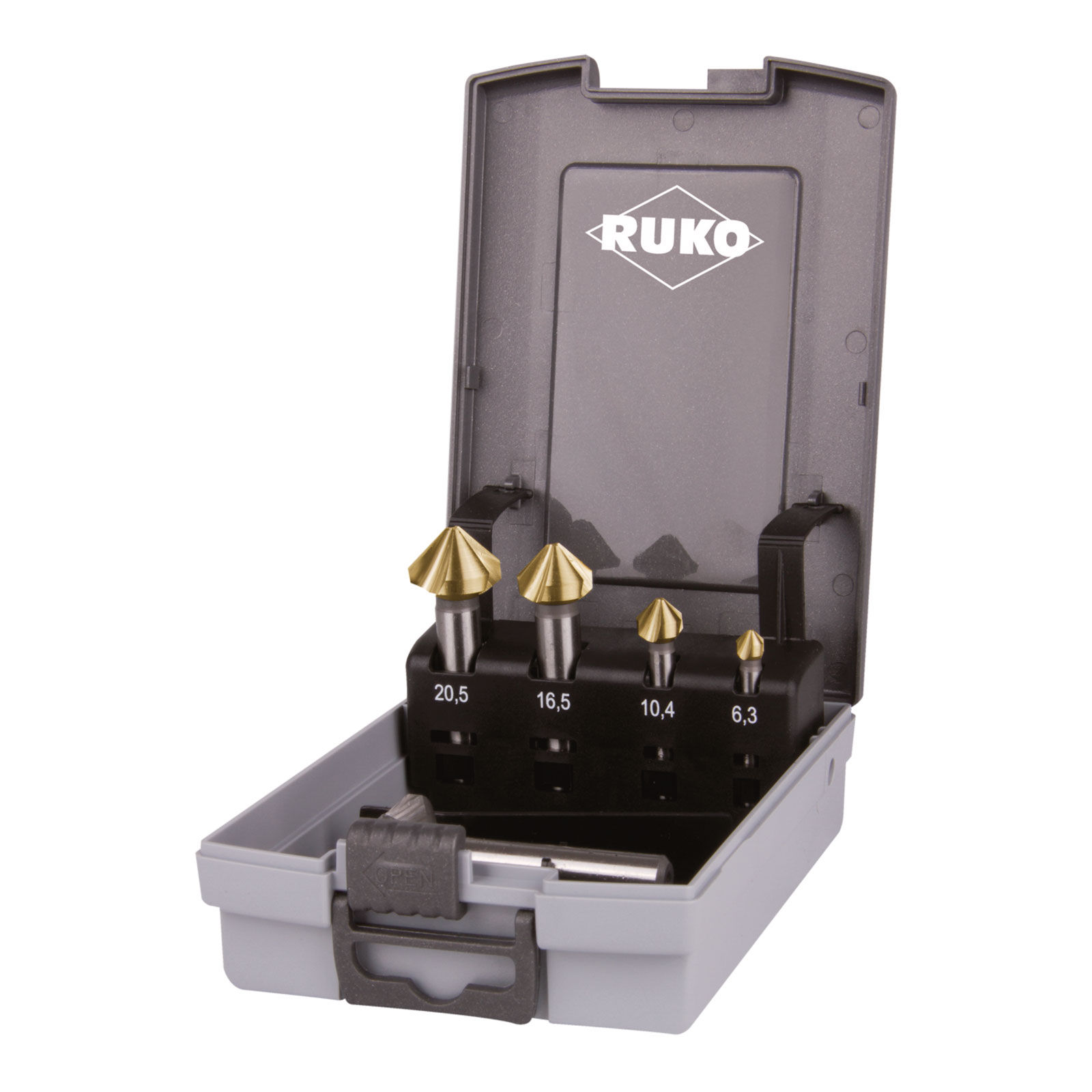 "RUKO Kegel- und Entgratsenker-Satz DIN 335 Form C 90° HSS-TiN in ABS-Kunststoffkassette - 5 tlg. - 102154TRO"