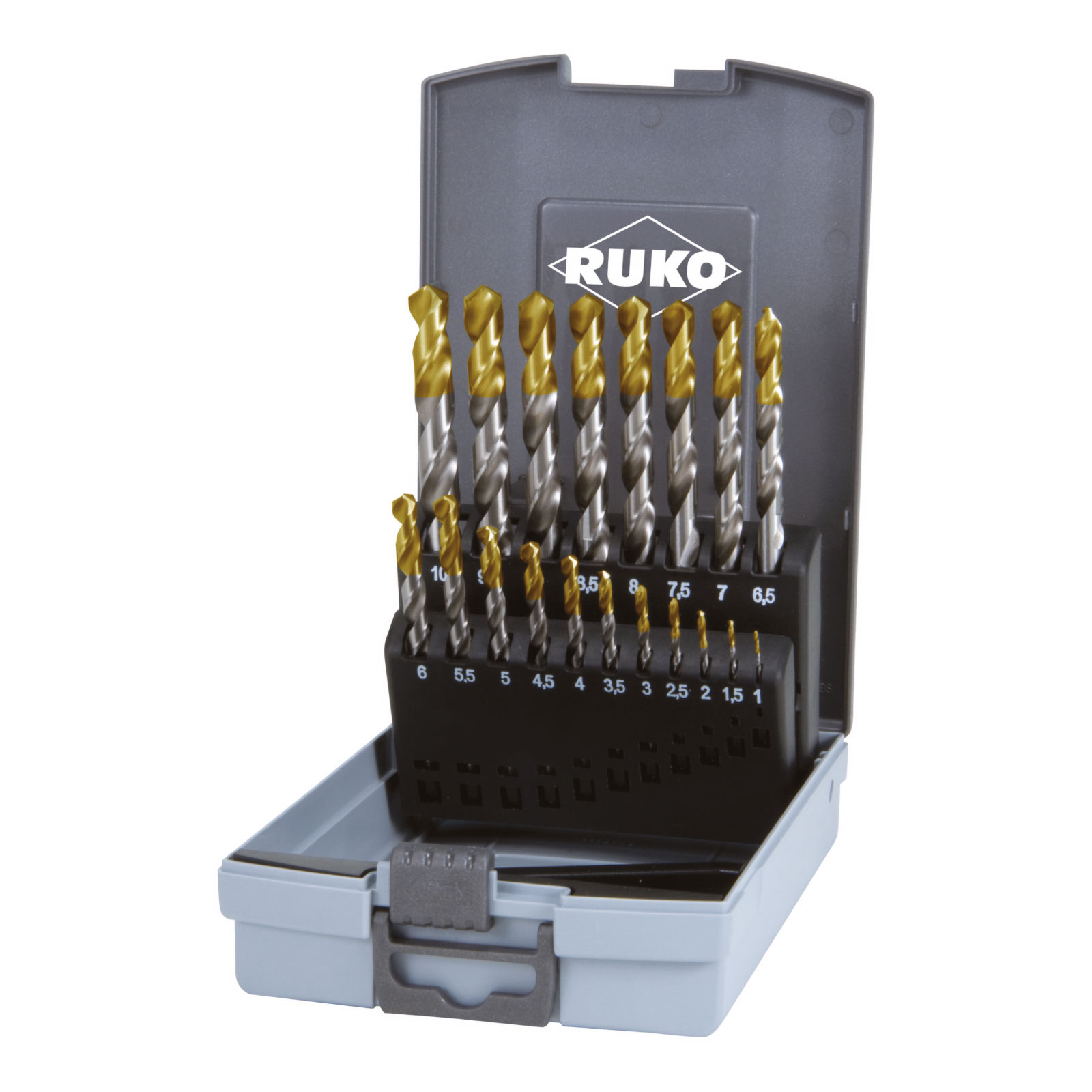 1x RUKO Spiralbohrer-Satz DIN 338 Typ N, HSS-G mit TiN Spitzenbeschichtung in Kunststoffkassette - 19 tlg.