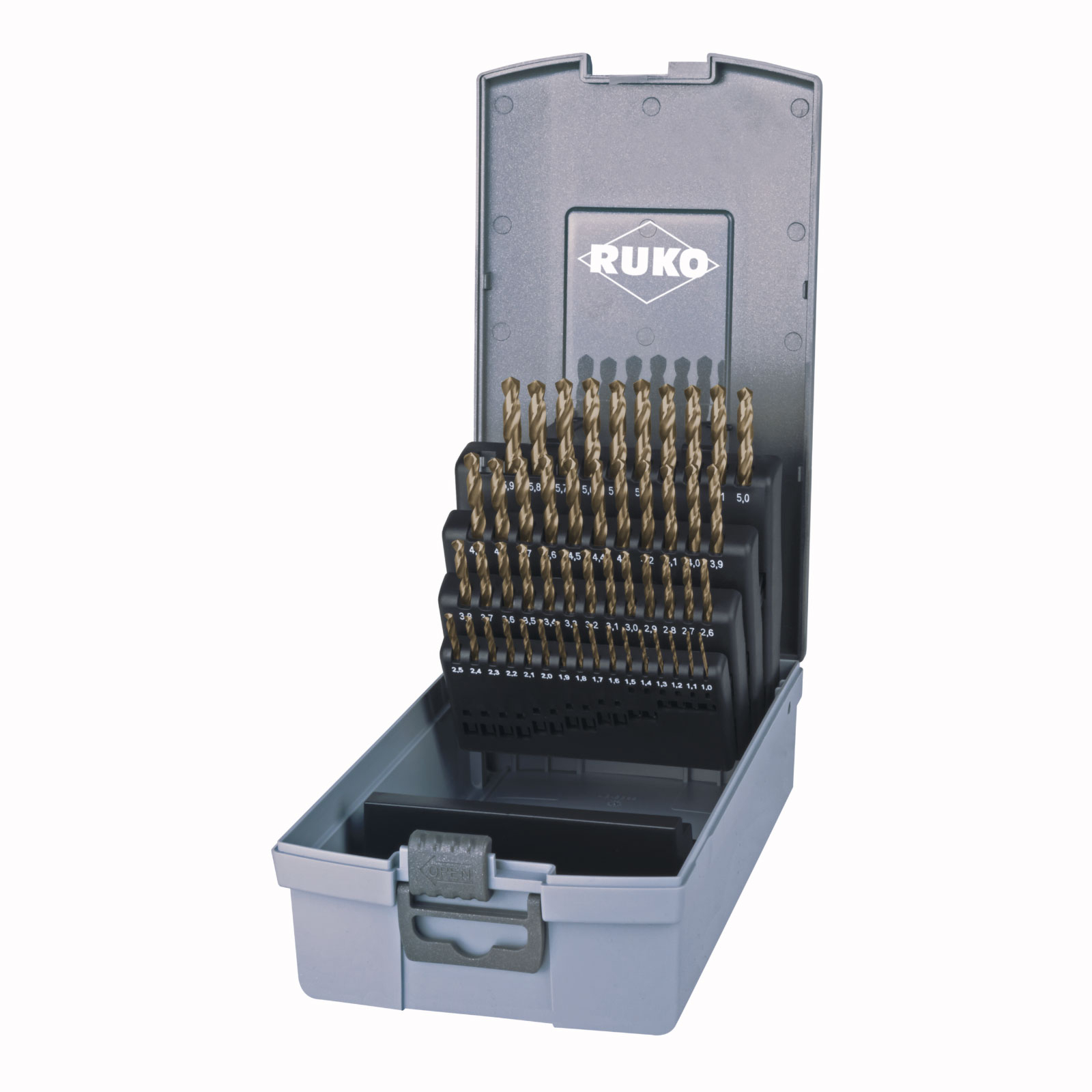 1x RUKO Spiralbohrer-Satz DIN 338 Typ N, HSS-R in Kunststoffkassette - 50 tlg.