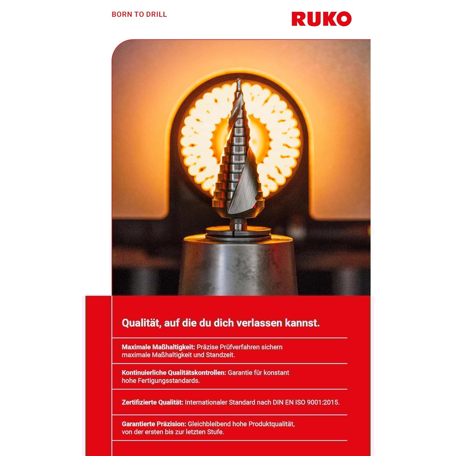 - Hohe Standzeit: Der 3-teilige RUKO Stufenbohrersatz besteht aus Hochleistungs-Schnellarbeitsstahl (HSS), der eine dreifache bis vierfache höhere Schnittleistung als normaler Werkzeugstahl bietet