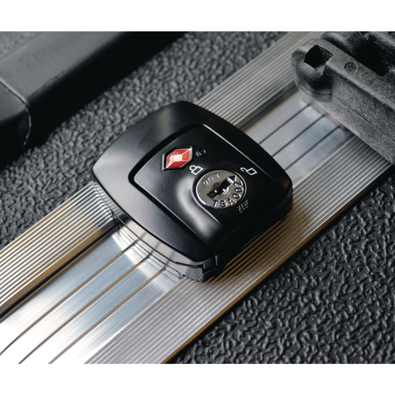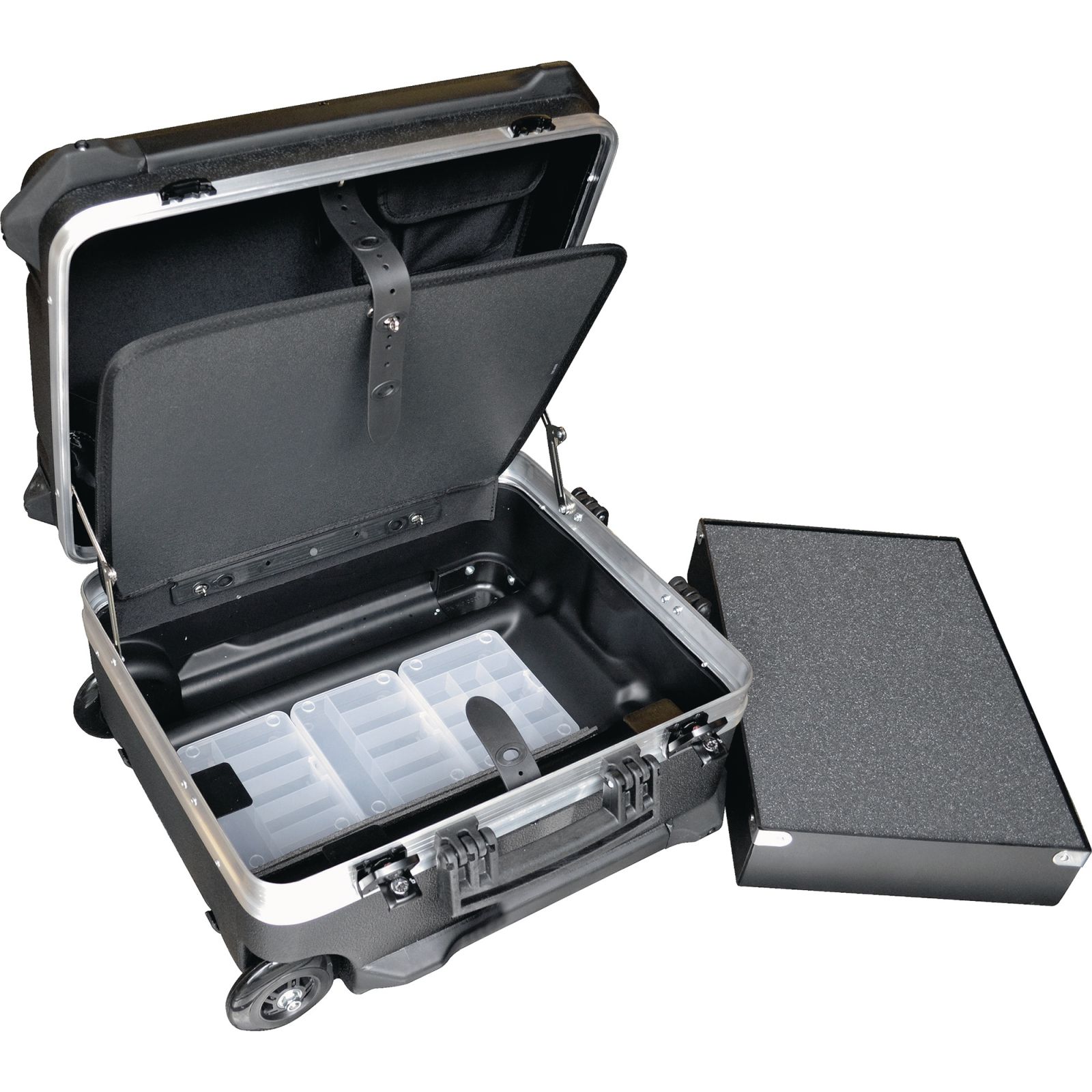 rollbar · Kofferschalen aus extrem widerstandsfähigem und schlagzähem HDPE-Kunststoff · stabiler Aluminiumrahmen · verstärkte Ecken · zwei Schlösser (abschließbar) · zwei kugelgelagerte Räder (Ø 120 mm) · Öffnungssystem mit Gasdruckfedern · 2-fach-Teleskopauszug, ca. 1100 mm lang · PP-Standfüße · stapelbar · mit TSA-Schloss · Tragfähigkeit 40 kg · Ausstattung: · 1 Bodenschale · 1 Bodenschalenabdeckung (Werkzeugtafel mit 6 Einsteckfächern und 12 Einstecklaschen) · 3 herausnehmbare Kleinteilemagazine (in der Bodenschale einliegend) · 1 Einsatzschale mit Rasterschaumeinlage in der Bodenschale (zum Beispiel für empfindliche Messgeräte) · 1 Werkzeugtafel doppelseitig bestückbar: Vorderseite 11 Einsteckfächer + Tasche für Kleinteile, Rückseite 13 Einsteckfächer + 12 Einstecklaschen · 2 Dokumentenfächer Besondere Produktvorteile: Dieser Koffer bietet mit seiner Höhe von 300 mm Stauraum auch für große und sperrige Werkzeuge Europäisches Qualitätsprodukt