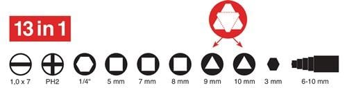 für alle gängigen Absperrsysteme der Gas-, Wasser- und Elektrizitätsversorgung sowie für technische Anlagen in Gebäuden wie Klima- und Belüftungsanlagen, Absperrventile, Netzschalttafeln usw. Funktionen: 1. stufiger Vierkant 6 - 9 mm 2. Innenvierkant 6 - 7 mm 3. Innenvierkant 7 - 8 mm 4. Innendreikant 9 mm 5./6. Doppelbit Kreuz PH Gr. 2 / Schlitz 7 mm Kunststoffadapter für Bits 6,3 mm (1/4”) Entlüftungsvierkant 5 mm
