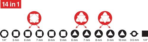 für alle gängigen Schließungen, Schaltschränke, Haupt- und Unterverteilungen, Abfallbehälter, Heizungsentlüftungen usw. Schwenkarme um 360° drehbar durch ein neu eingesetztes Gelenk, kann der Universalschlüssel sowohl als T-Griff mit hohem Drehmoment oder in der kompakten, zusammengesteckten Variante eingesetzt werden Funktionen: 1. Innenvierkant 5 mm 2. Innenvierkant 6 - 7 mm 3. Innenvierkant 8 - 9 mm 4. Innendreikant 5 - 6 mm 5. Innendreikant 6 - 7 mm 6. Innendreikant 8 - 9 mm 7. Buntbart 3 - 5 mm 8. Bitaufnahme 6,3 mm (1/4”) 9. Aufnahme für 6,3 mm (1/4”) Steckschlüsseleinsätze