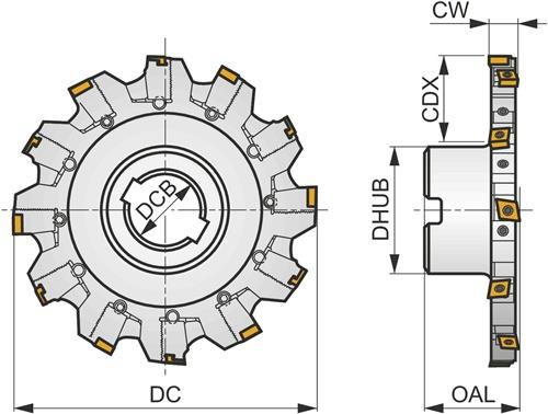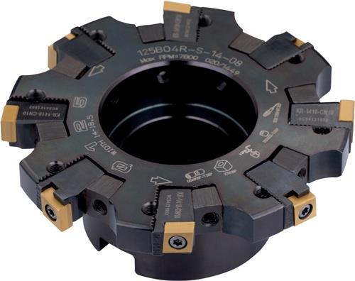 Scheibenfräser mit positiver/negativer Geometrie zum spannen von 8 Stück CNHQ 1005.. doppelseitigen Wendeschneidplatten · Schnittdurchmesser 125mm mit 90° Anstellwinkel und 40mm Verbindungsbohrung gemäß DIN 8030-B · 50mm Überstandslänge zum tiefen Nutfräsen mit einer schnittbreite von 14,0 ÷ 18,5mm Weitere technische Eigenschaften: · Anzahl peripherer Kanten im Werkzeug: 8 · Axialer Spanwinkel: 4Grad · Bruttogewicht: 1742,9g · Effektive Schneidkantenzahl: 4 · Fräserdesign: S90CN(XN) · Gesamtlänge - Metrisch: 50mm · Klemmtypcode: S - Schraubklemmung durch Bohrung · Maximale Drehzahl: 7800rpm · Maximale Einstechtiefe - Metrisch: 25mm · Nabendurchmesser - Metrisch: 70mm · Nettogewicht: 1650g · Radialer Spanwinkel: -10Grad · Schaft: Aufsteckfräser DIN 8030 B · Schneiddurchmesser - Metrisch: 125mm · Schneidrichtung: Rechts · Spannbohrungsdurchmesser - Metrisch: 40mm · Wendeplatten Indexzahl: 8