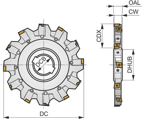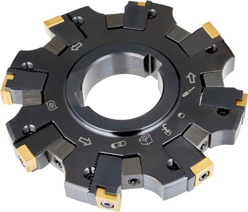 Scheibenfräser mit positiver/negativer Geometrie zum spannen von 8 Stück CNHQ 1005.. doppelseitigen Wendeschneidplatten · Schnittdurchmesser 125mm mit 90° Anstellwinkel und 40mm Verbindungsbohrung gemäß DIN 8030 · zum tiefen Nutfräsen mit einer schnittbreite von 14,0 ÷ 18,5mm Weitere technische Eigenschaften: · Anzahl peripherer Kanten im Werkzeug: 8 · Axialer Spanwinkel: 4Grad · Bruttogewicht: 1186,9g · Effektive Schneidkantenzahl: 4 · Fräserdesign: S90CN(XN) · Gesamtlänge - Metrisch: 18mm · Klemmtypcode: S - Schraubklemmung durch Bohrung · Maximale Drehzahl: 7800rpm · Maximale Einstechtiefe - Metrisch: 34mm · Nabendurchmesser - Metrisch: 56mm · Nettogewicht: 1186,9g · Radialer Spanwinkel: -10Grad · Schaft: Aufsteckfräser DIN 8030 – Scheibenfräser · Schneiddurchmesser - Metrisch: 125mm · Schneidrichtung: Neutral · Spannbohrungsdurchmesser - Metrisch: 40mm · Wendeplatten Indexzahl: 8