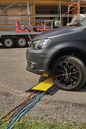 mit drei Kanälen zum Schutz von Schläuchen oder Kabeln, die nicht dauerhaft verlegt sind Abmessung Kabelkanäle H 50 x B 68/57/65 mm keine Befestigung nötig aus schwarzem vulkanisiertem Vollgummi und rutschhemmende Oberfläche mit gelben Schutzdeckel und Tragegriff überfahrbar bis zu einem Achsgewicht von 8 t Endlosmontage mit Zapfen/Nut-System Ausführung: 3 Kanäle Gewicht: 16,5 kg Breite: 500 mm Länge: 900 mm Tragfähigkeit: 8 t Farbe: schwarz/gelb Material: Gummi Höhe: 70 mm