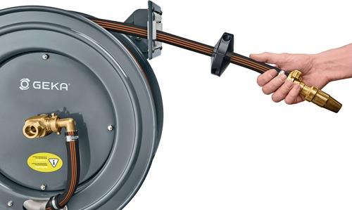 GEKA® plus Automatischer Schlauchaufroller · pulverbeschichtete Stahlkonstruktion · automatischer Rückzug des Schlauchs · für Wand-, Boden- und Deckenmontage · fertig montiert und einsatzbereit · schwenkbare Wandhalterung separat erhältlich Material: Gehäuse: pulverbeschichteter Stahl Abmessungen: 52,5 x 21 x 50,5 cm Weitere technische Eigenschaften: · Gewicht: 24,4kg