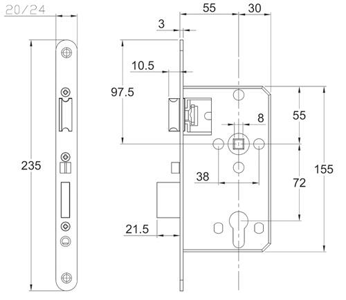 - 1x Schnegel WAT-Einsteckschloss PZW 20/55/72/8mm DIN L/R VA rd 008/1499/55