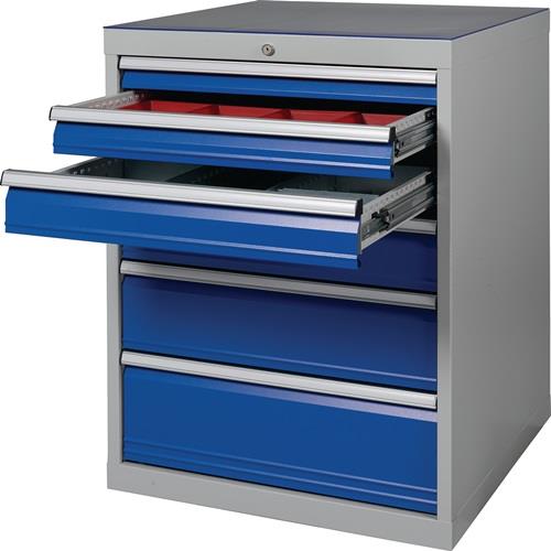 präzise Stahlblechkonstruktion mit robuster Pulverbeschichtung (Strukturlack) · Gesamttragfähigkeit 1500 kg · Schubladenführungen mit 100 % Vollauszug und absoluter Einzelauszugsperre mit Zentralverschluss · Aluminium-Griffleisten mit Beschriftungsstreifen und Klarsichtabdeckung · Innenmaße B 600 x T 600 mm · Tragfähigkeit pro Schublade 100 kg Weitere technische Eigenschaften: · Schubladeninnentiefe: 600mm · Schubladeninnenbreite: 600mm