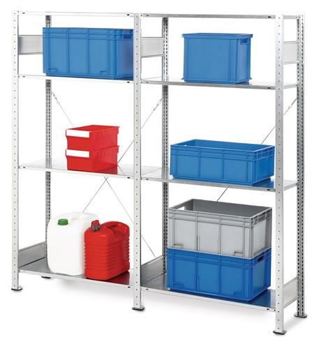 - Fachböden verzinkt mit verstärktem Kastenprofil, H 25 mm, höhenverstellbar im 25-mm-Raster