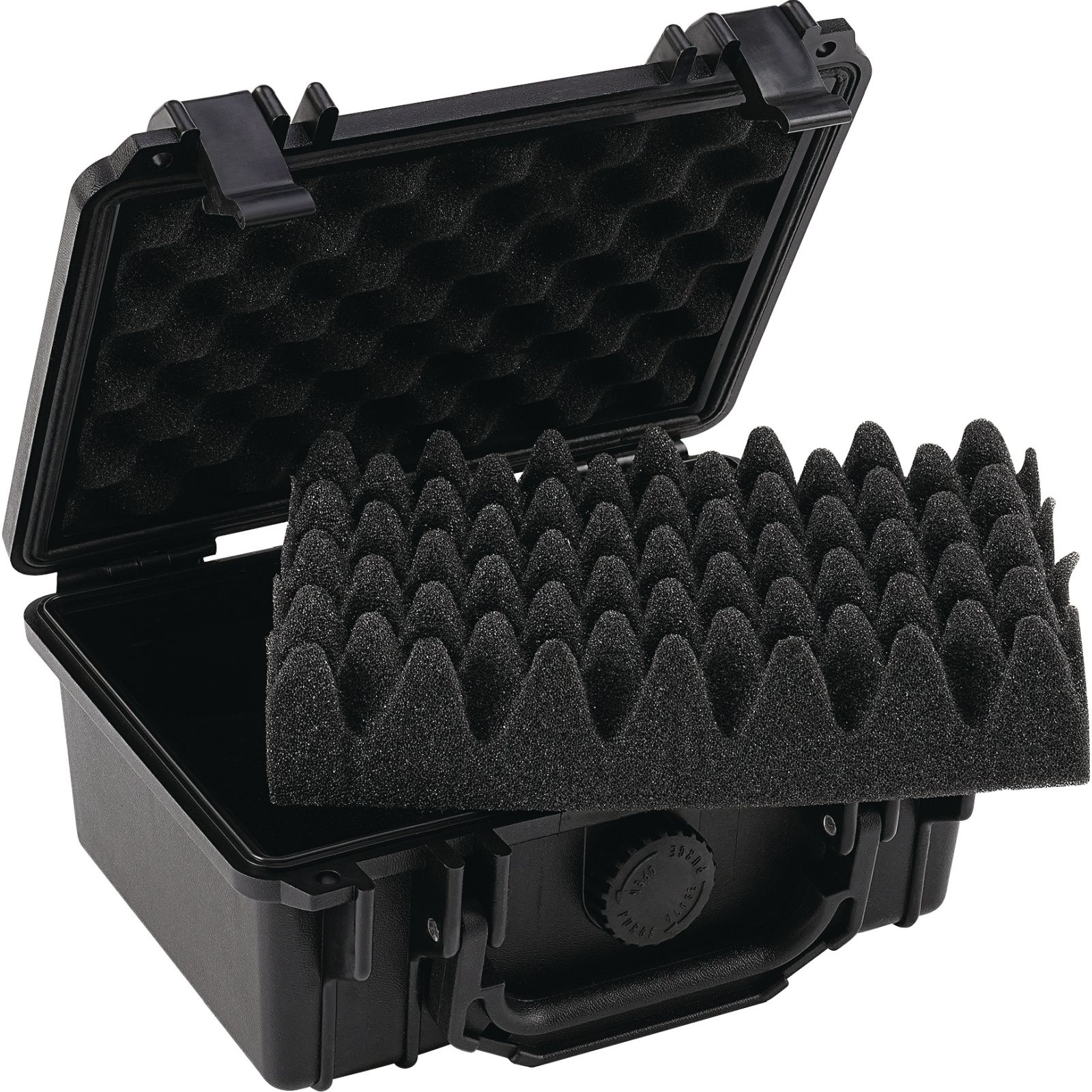 schwarz · luft- und wasserdicht · mit vorgerasteter Schaumeinlage zur leichten individuellen Gestaltung des Innenraums · Schlösser, Lufteinlassschraube, Tragegriff, shock-proof · aus schlagfestem Kunststoff · Verschlussmöglichkeit mit zwei Vorhangeschlössern · (Vorhangeschlösser gehören nicht zum Lieferumfang) Weitere technische Eigenschaften: · Farbe: schwarz