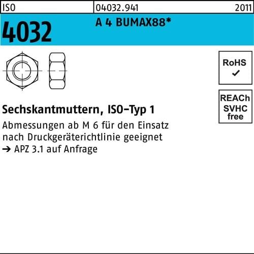 ISO 4032 A 4 BUMAX88 Sechskantmuttern · ISO-Typ 1 - Abmessung: M 10 VE=S (50 Stück) Weitere technische Eigenschaften: · Gruppencode: 04032.941