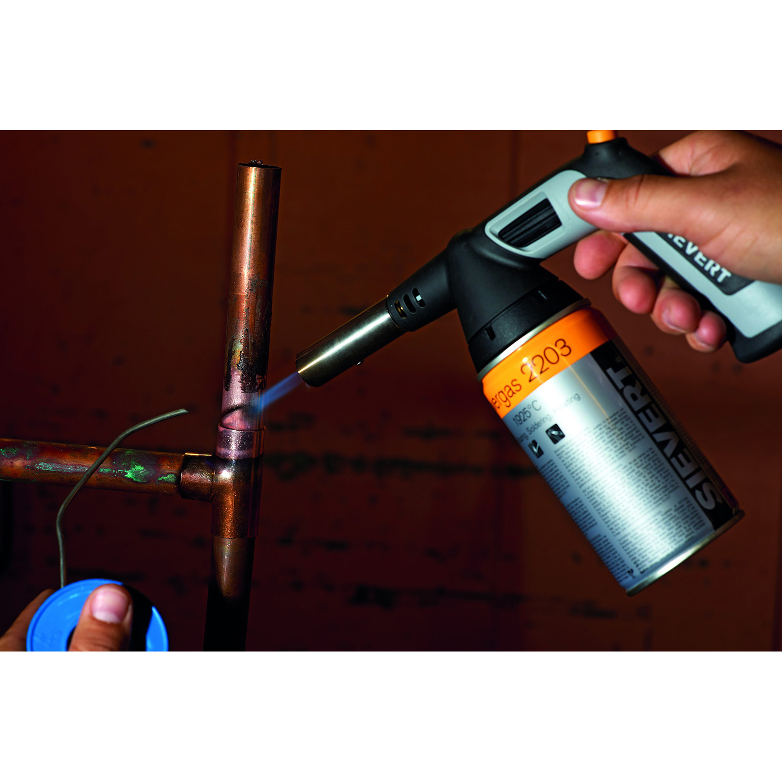 mit Piezozündung ohne Schraubkartusche stabiles Flammenbild bei Überkopfarbeiten für Hart- und Weichlöt- und Farbentfernungsarbeiten mit Gasvorwärmung zur Verwendung mit Schraubkartusche Powergas 2203 bzw. 2204 Leistung: 1,8 kW Gasverbrauch: 140 g/h Flammentemperatur: 1925 °C Ausführung: ohne Schraubkartusche Marke: SIEVERT
